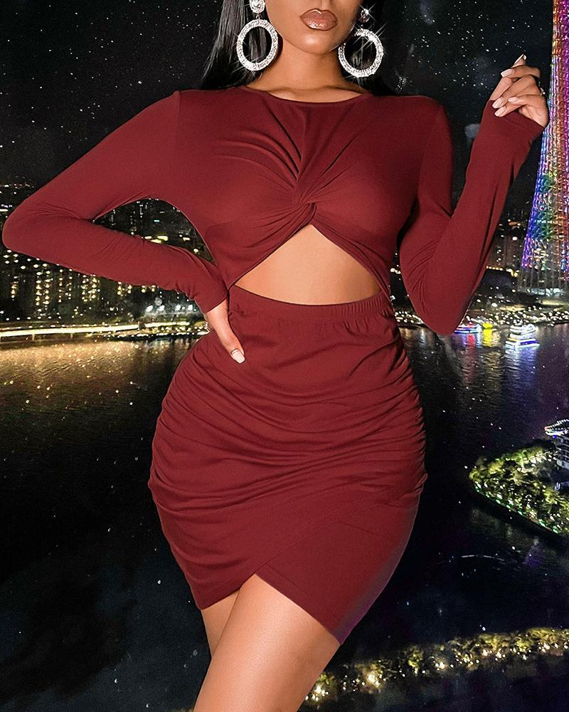 Solid Twist Cut Out Front Ruched Overlap Mini Dress