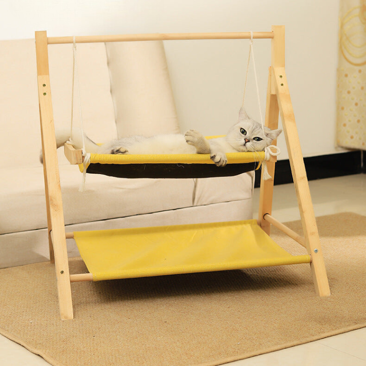 Introducing the Solid Wood Double-layer Cat Hammock Swing Hanging Bed. the perfect addition to your cat's lounging routine. Made with high-quality solid wood. this hammock offers double the space for your furry friend to relax and swing in. Give your cat the gift of comfort and style.