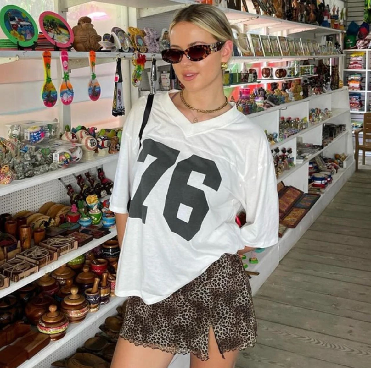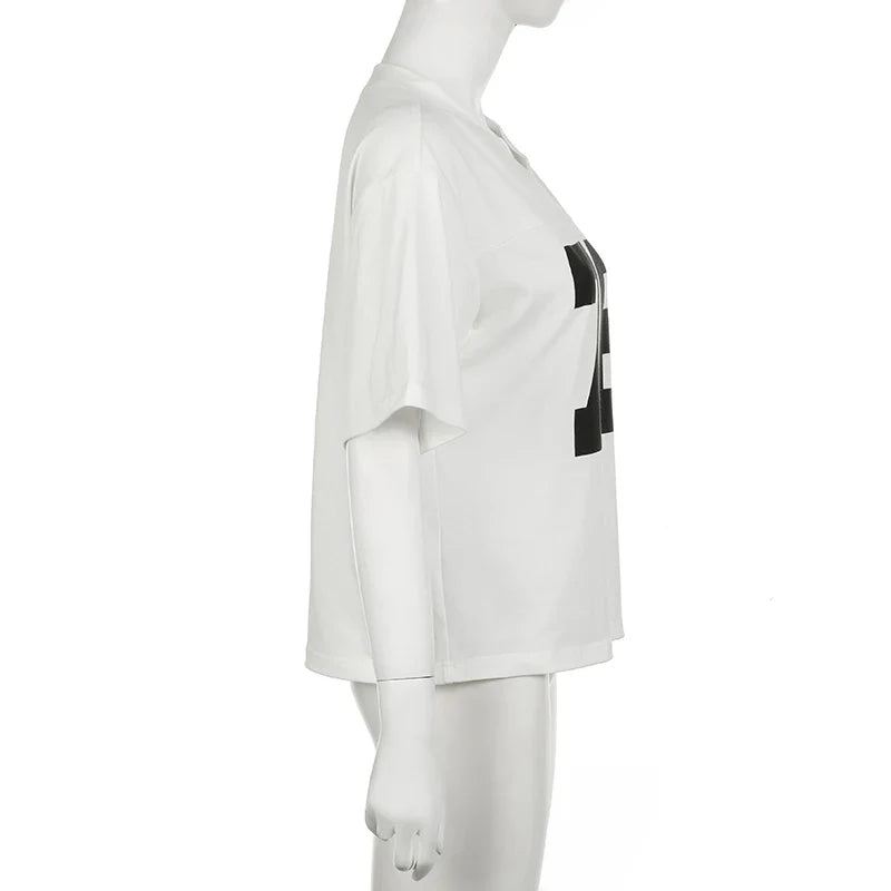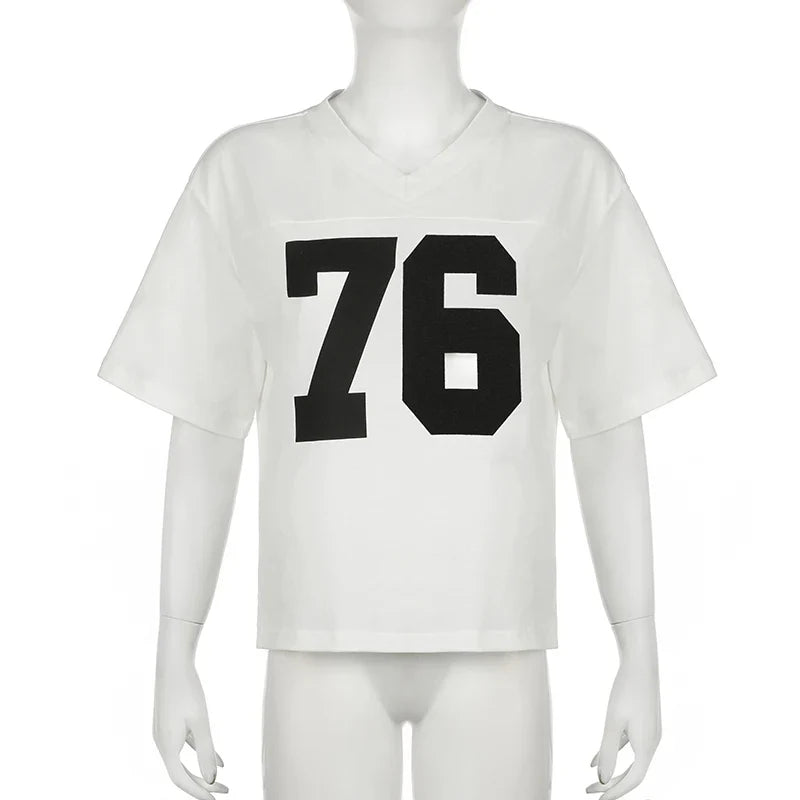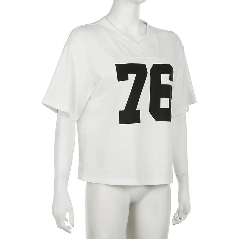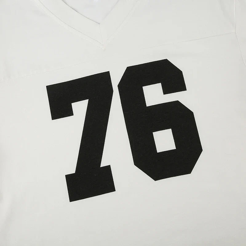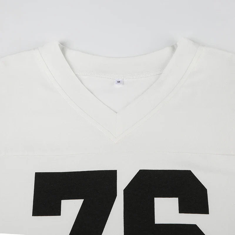 Channel all the sporty vibes with this Sport's Finest Jersey Top that is perfect for your everyday styling and beyond. Brought to you in a white cotton material with a number print design and a v-neck style. we simply can't get enough. With its versatile style this top is sure to be your new go-to. Style with your favorite shorts. box-fresh kicks and accessories for a look that we can't get enough of.