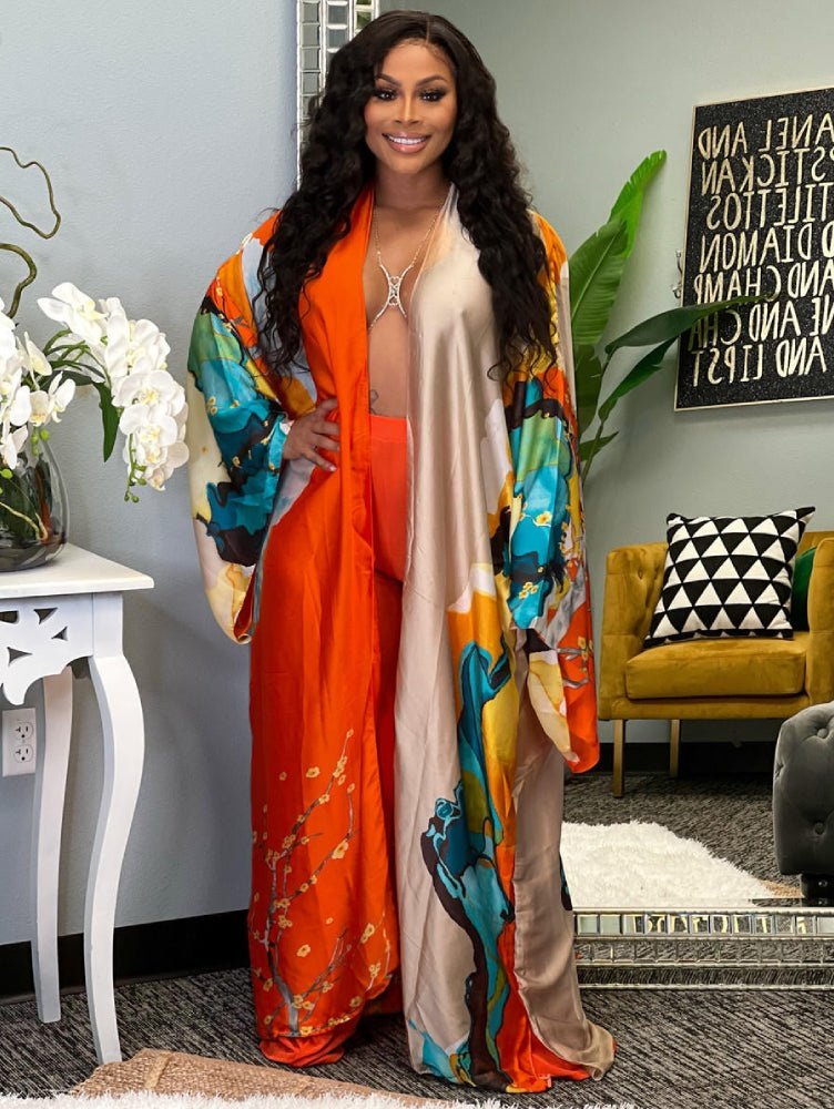 Flowy and Light Satin feel Kimono. Dress her up or down - your choice! This item is One Size (OS) and completely inclusive to all body types and sizes. (Tall Girl Friendly + fits up to a size 2x)