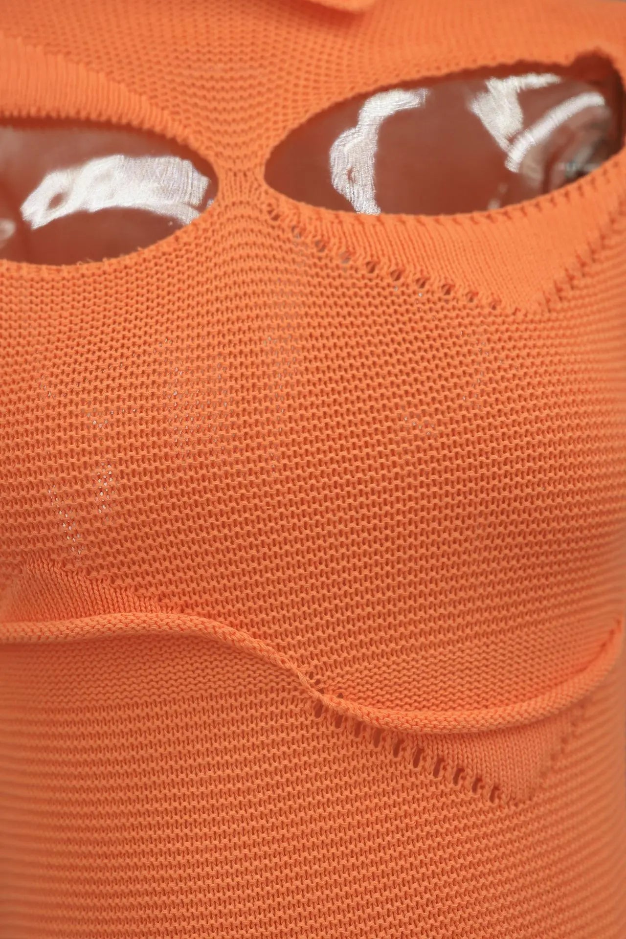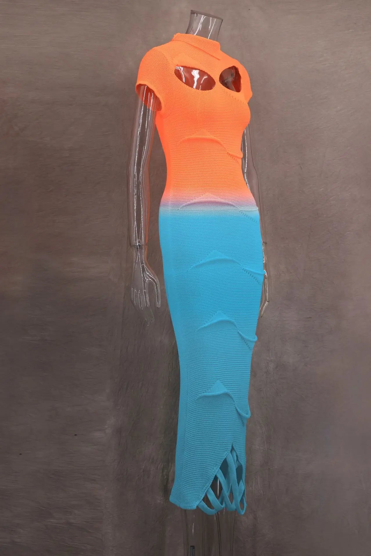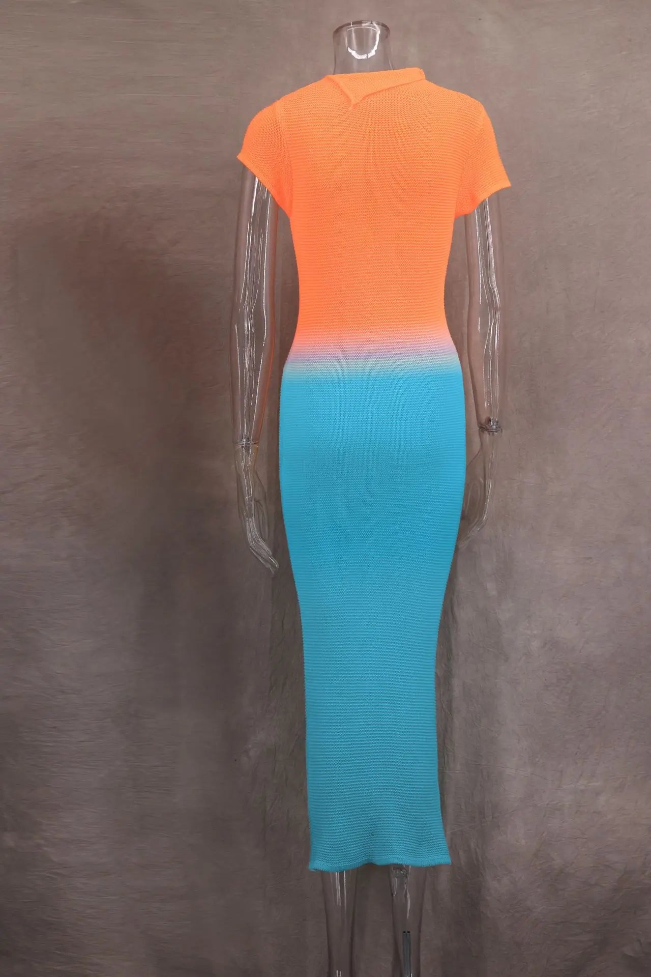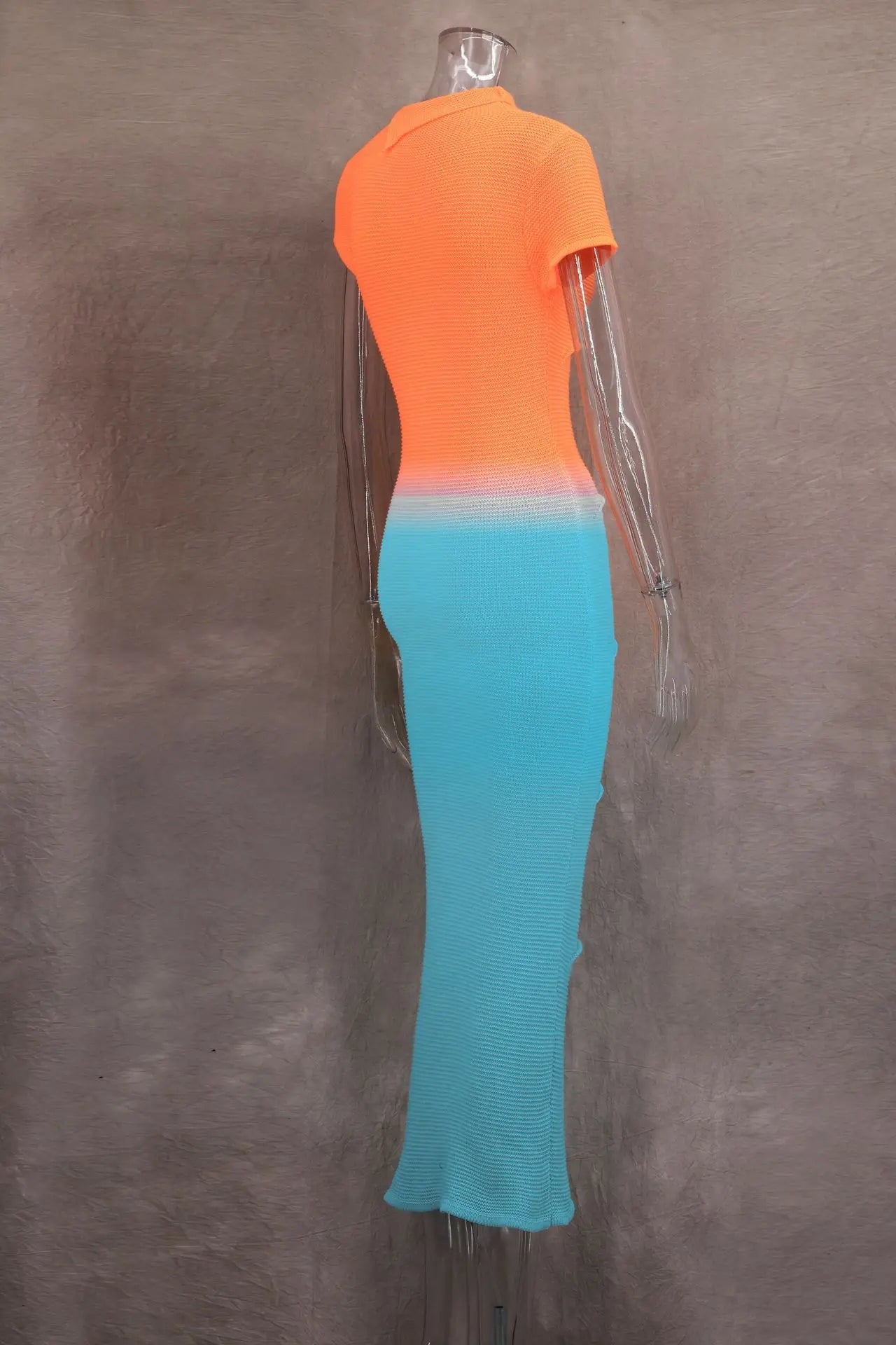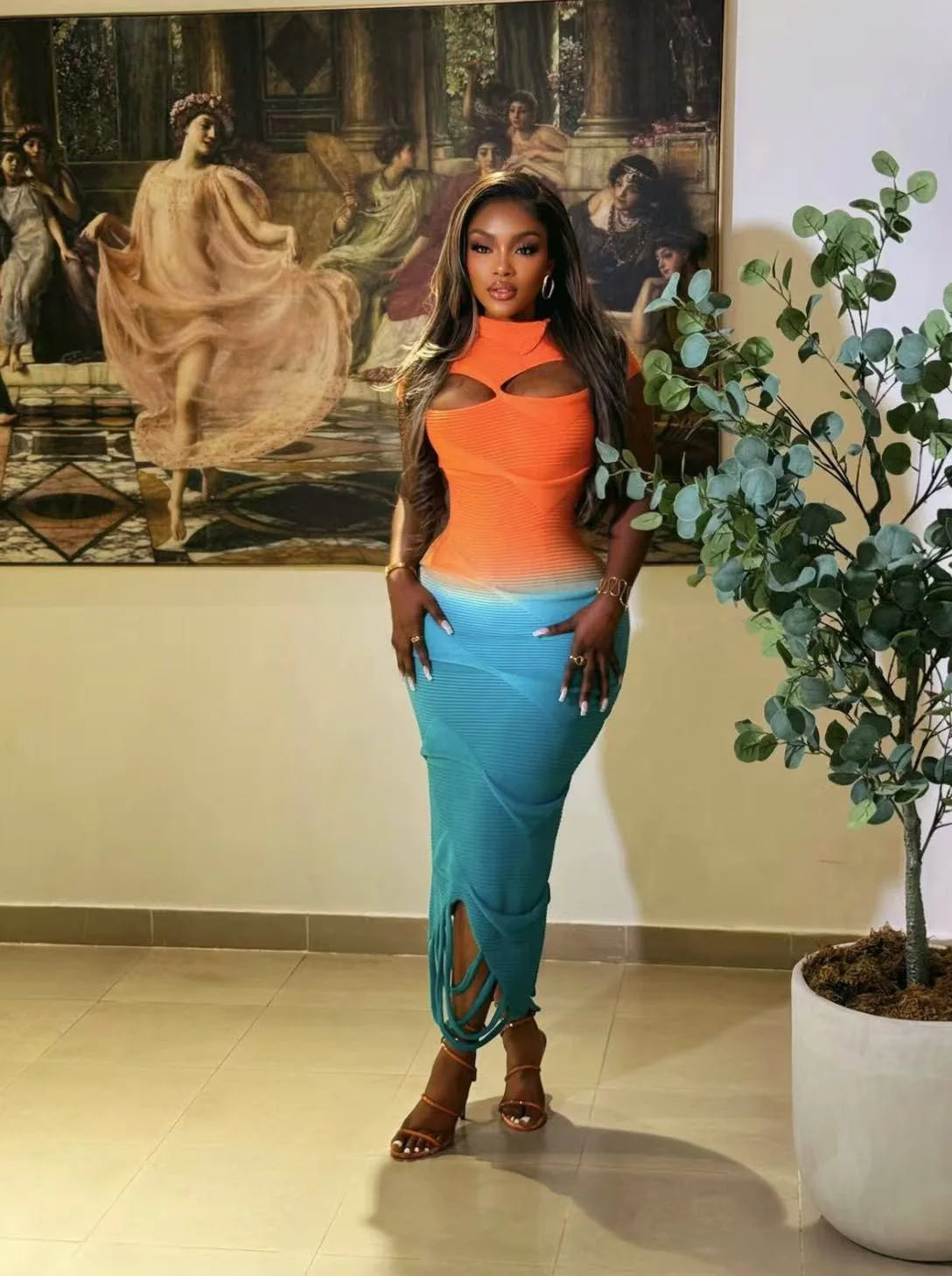 Elevate your dress attire with this Sunset Dreaming Maxi Dress. Cut from a PU sweater fabric that drapes beautifully. the vivid orange and blue color brings an artful edge to daytime or nighttime styling. Ground the look with gold accessories for a considered. quietly confident aesthetic.
