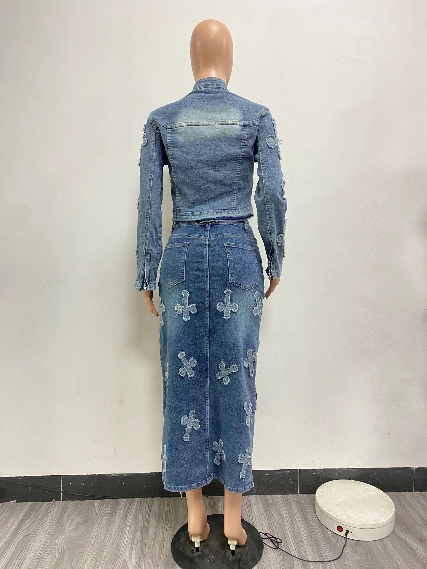 Get that chic. blogger-worthy vibe on point with this Super Babe Maxi Skirt Denim Two Piece Set. Featuring a light blue wash denim material with an all-over cross design. a zipped-up jacket. a maxi high waisted skirt to match. and a thigh high split. We are in love!