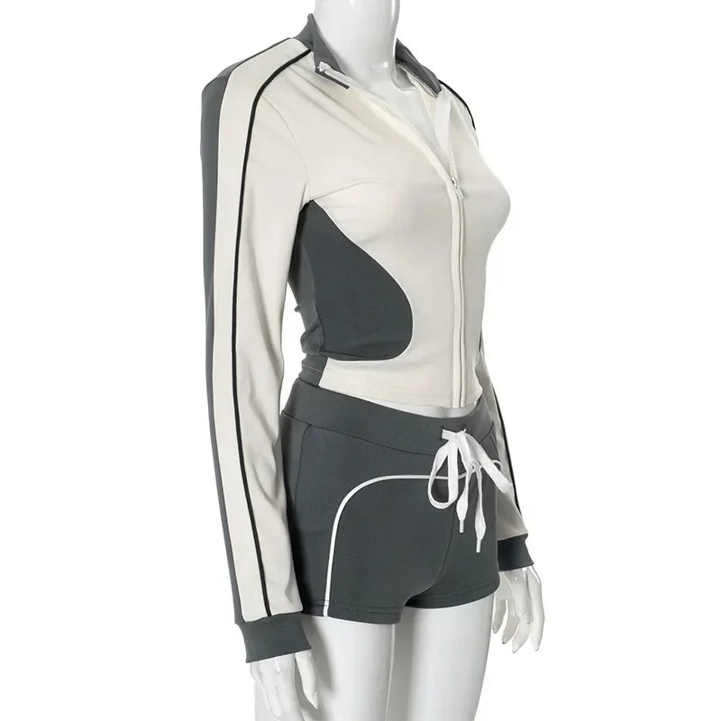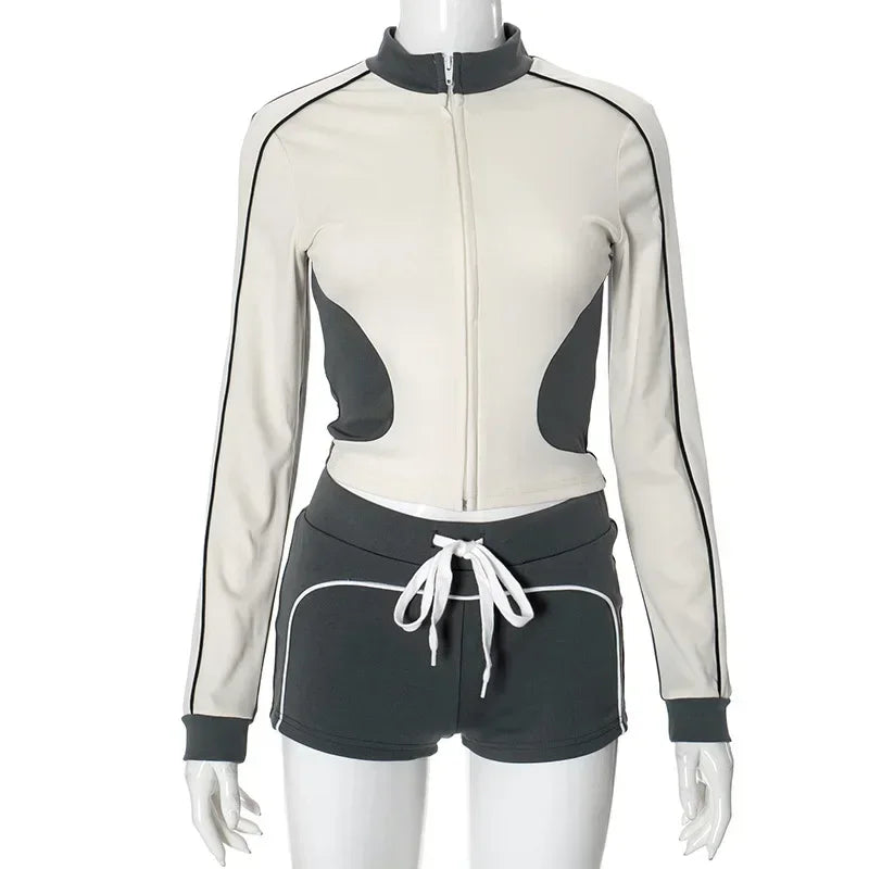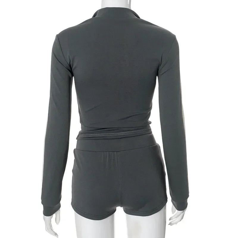 An elevated take on off-duty dressing. this Taking Over Two Piece Set offers a masterclass in understated cool. Featuring a light weight long sleeve zip up top and matching shorts. adds a utilitarian edge. The neutral gray hue lends itself to endless styling options. Team yours with sandals and minimum accessories for a lesson in effortless chic.