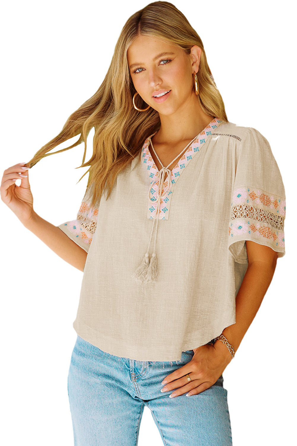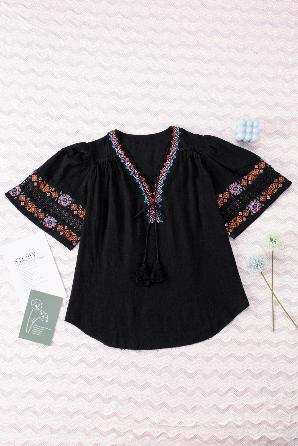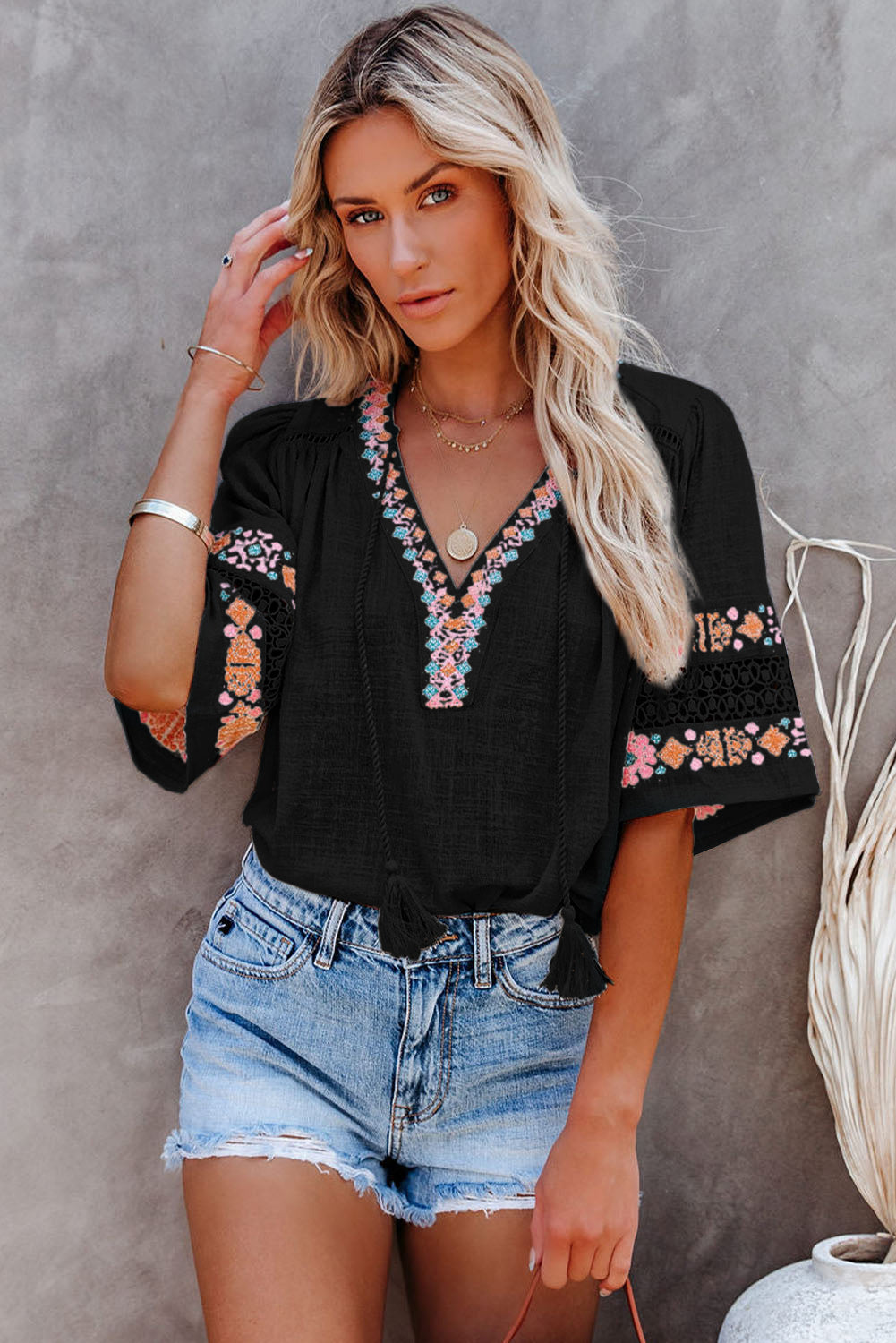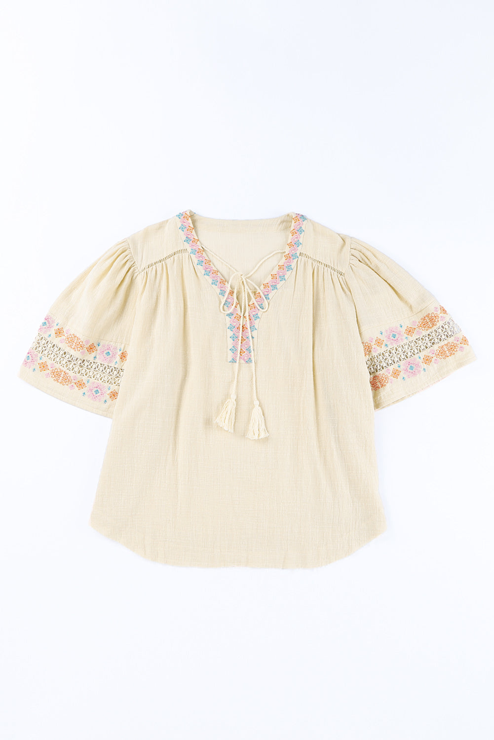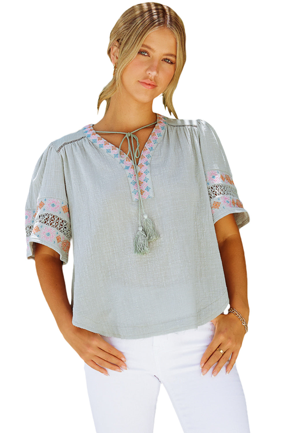 This Tassel Drawstring Embroidered Half Sleeve V Neck Top is the perfect addition to your wardrobe.
