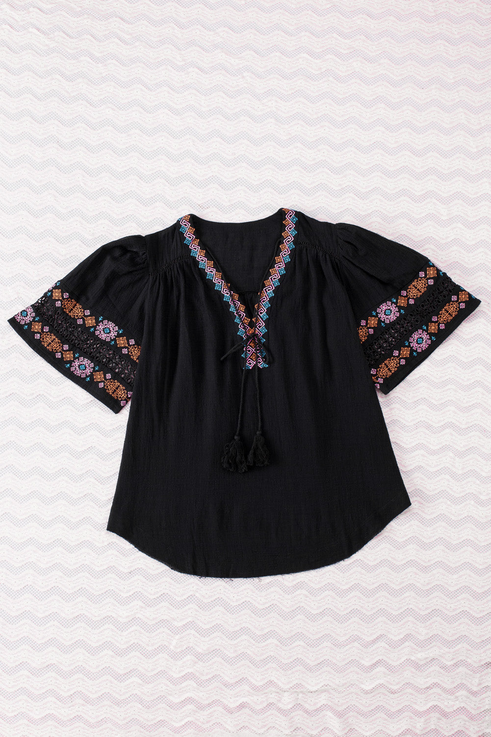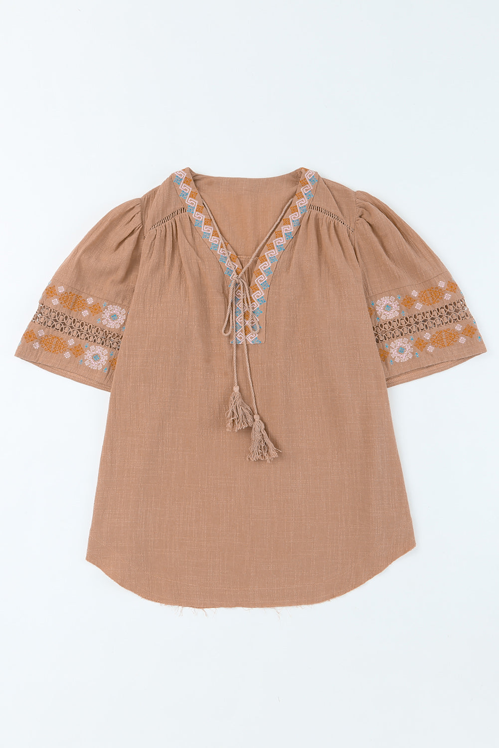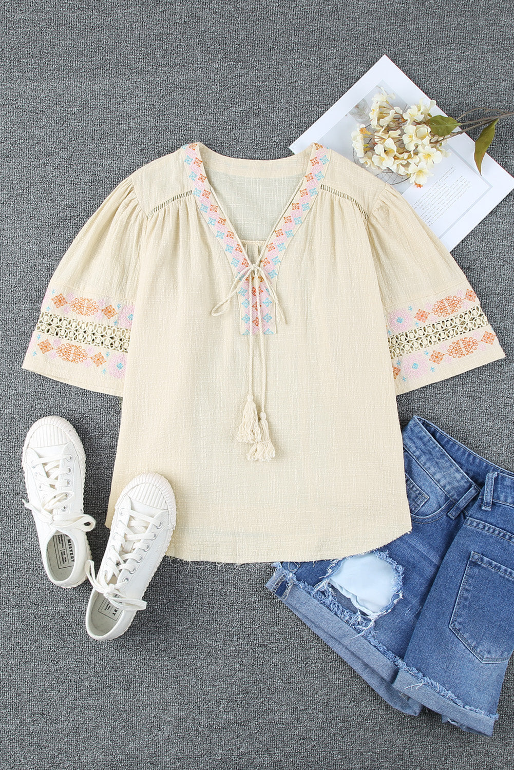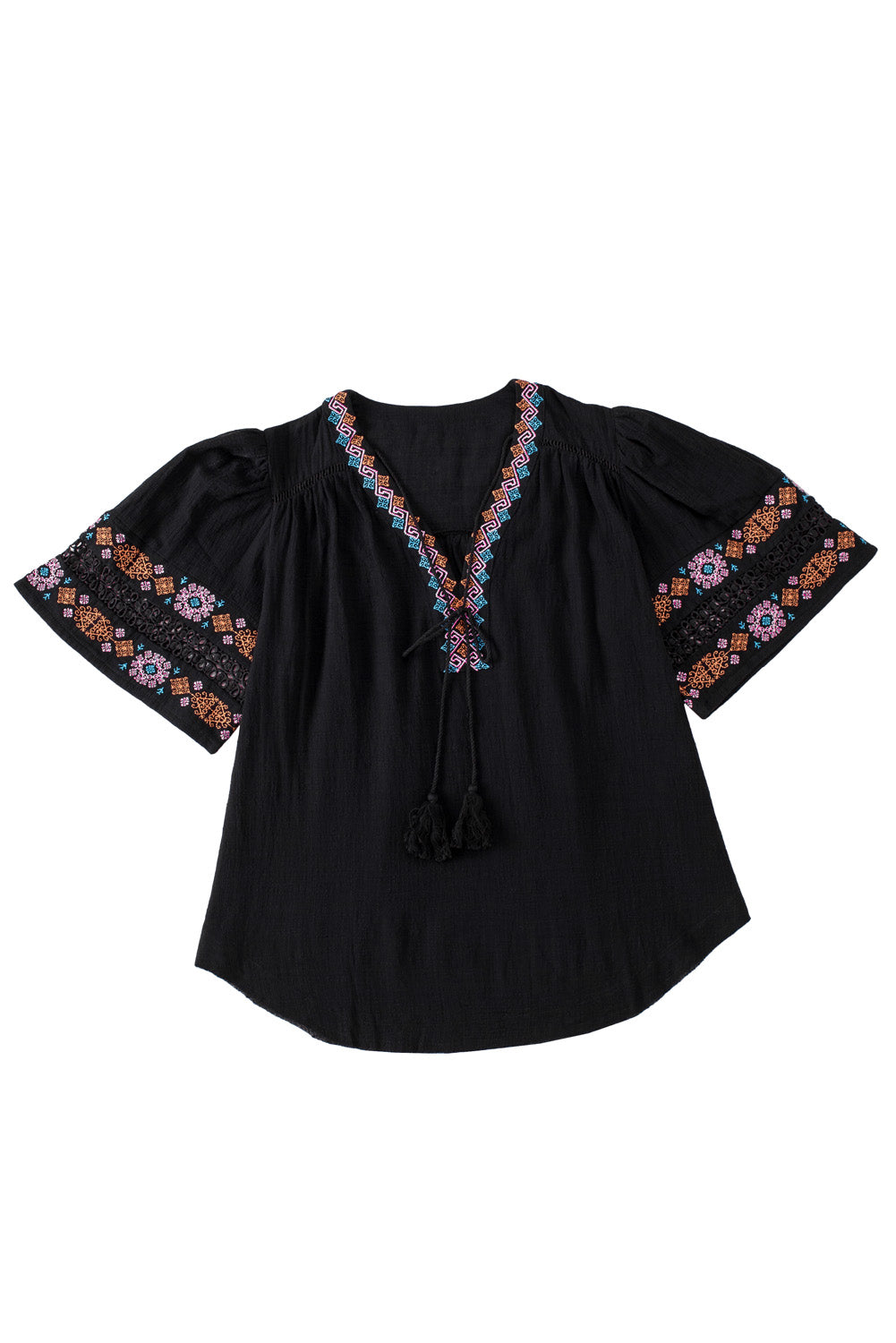 This Tassel Drawstring Embroidered Half Sleeve V Neck Top is the perfect addition to your wardrobe.
