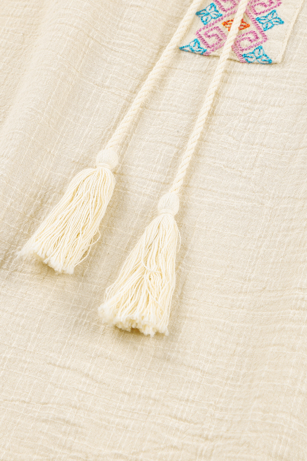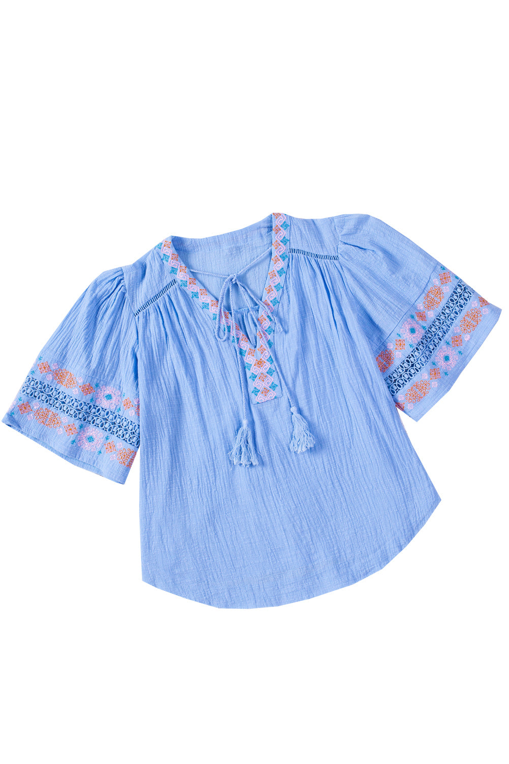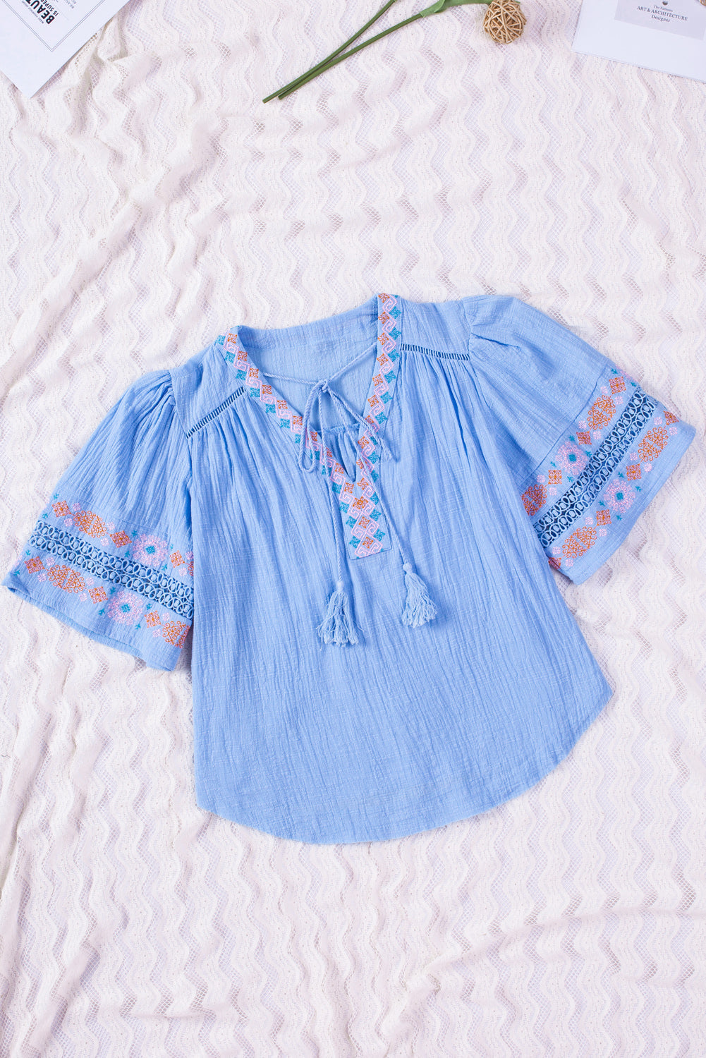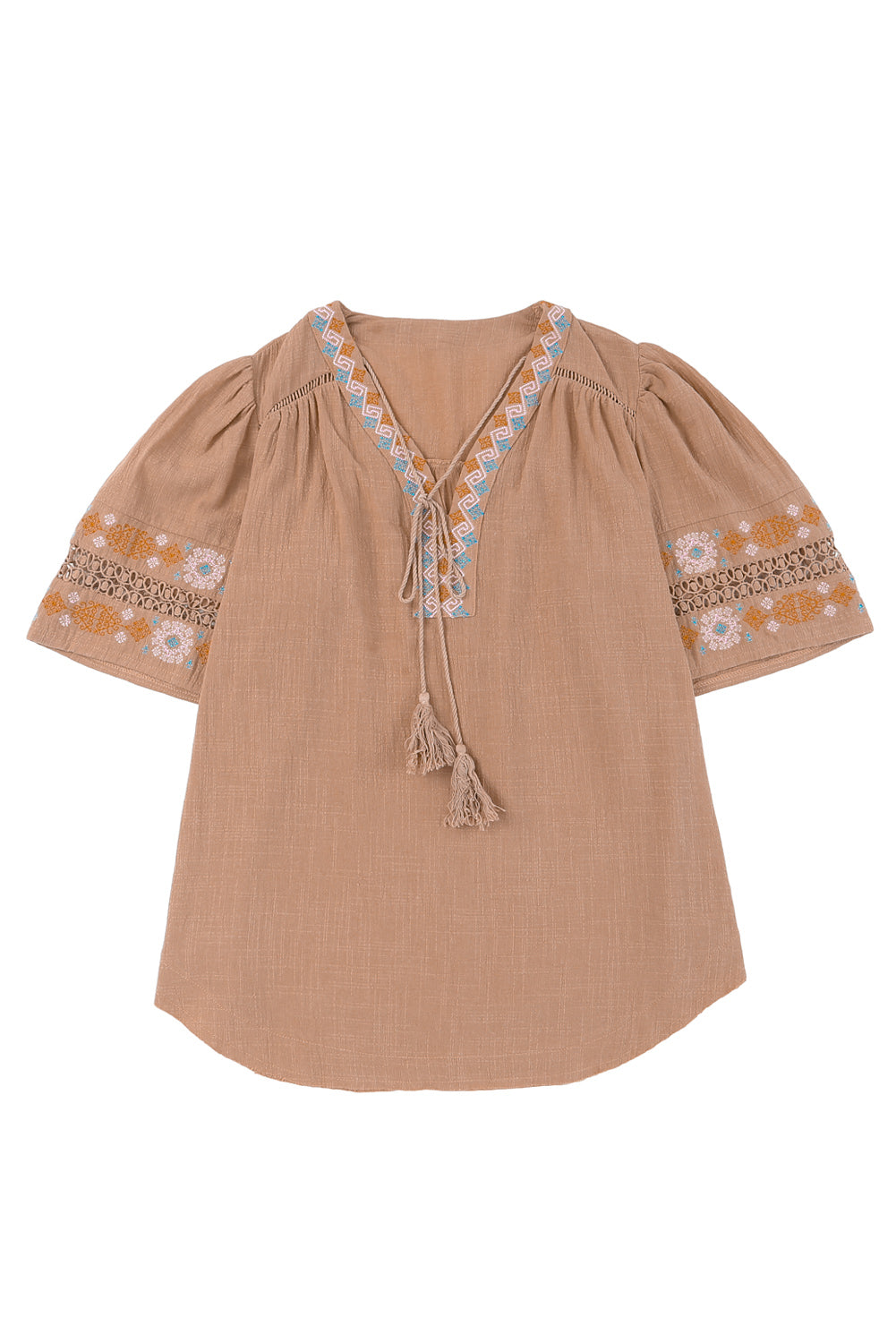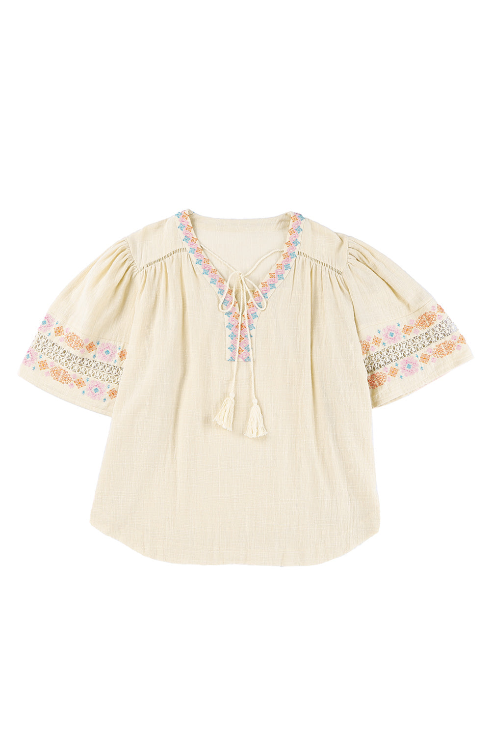 This Tassel Drawstring Embroidered Half Sleeve V Neck Top is the perfect addition to your wardrobe.
