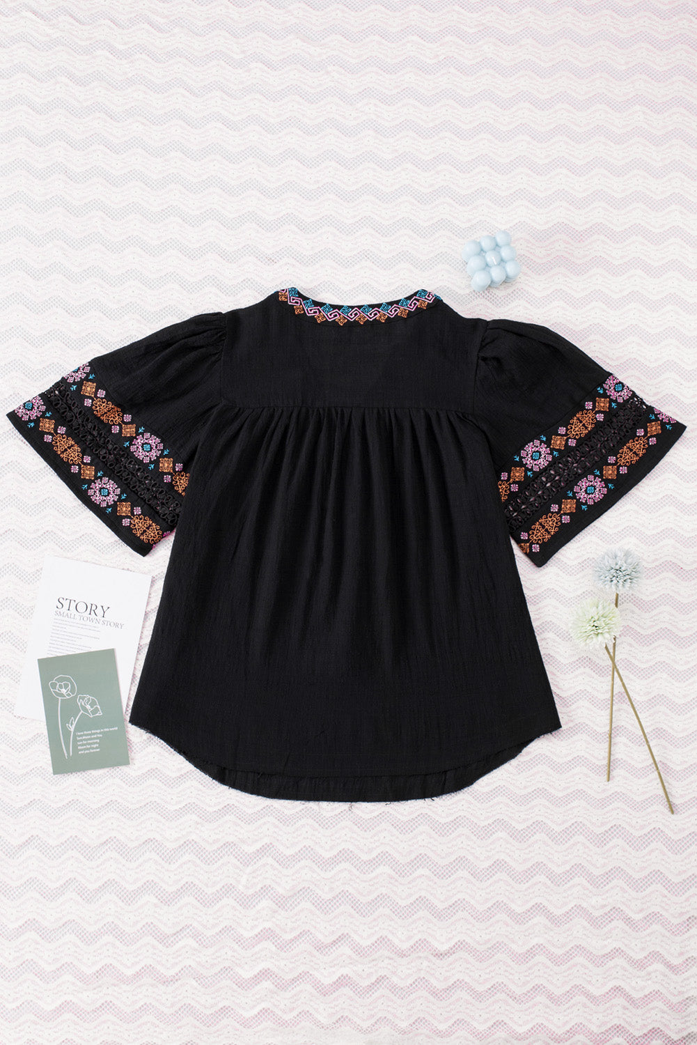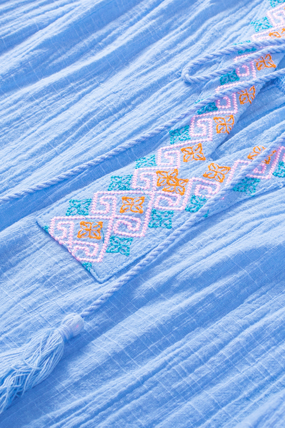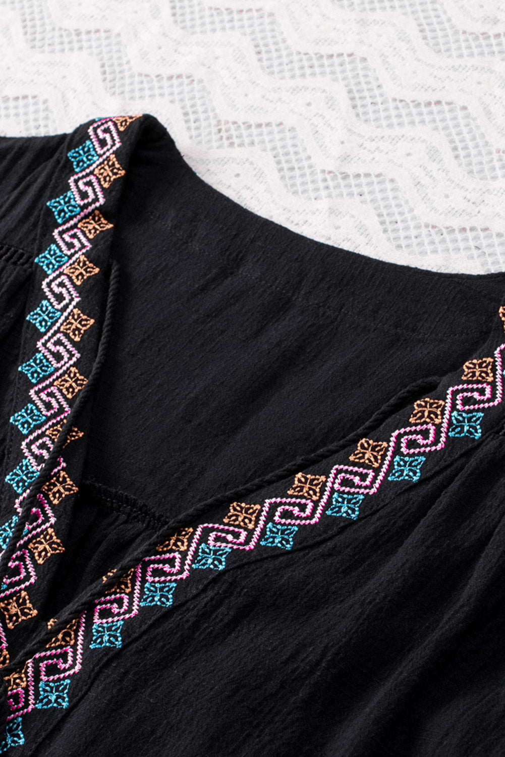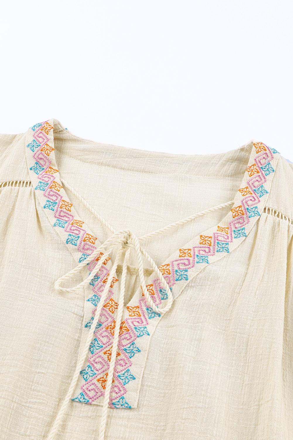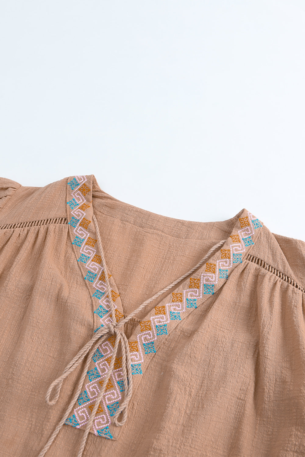 This Tassel Drawstring Embroidered Half Sleeve V Neck Top is the perfect addition to your wardrobe.