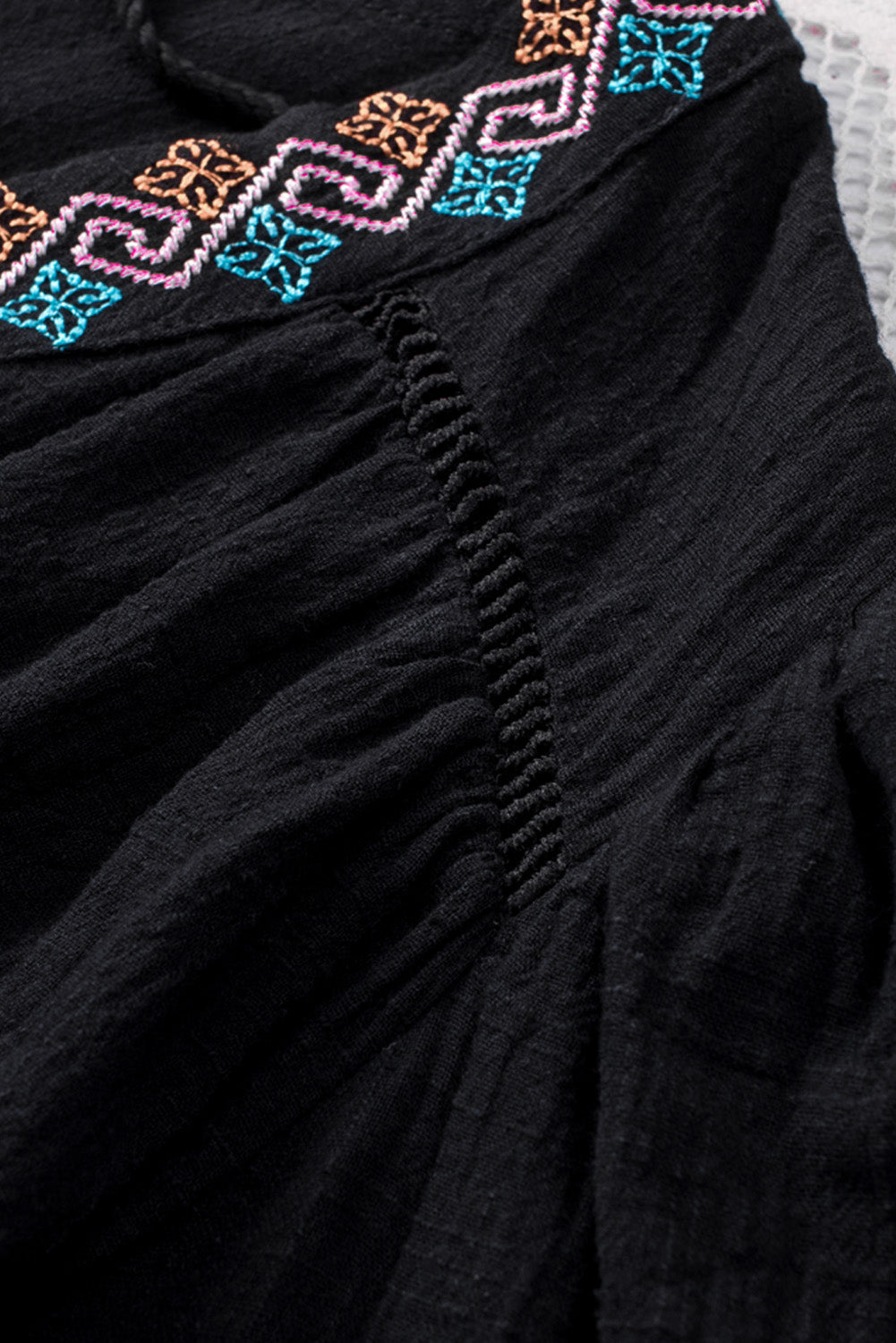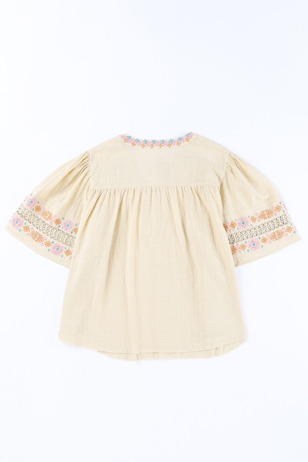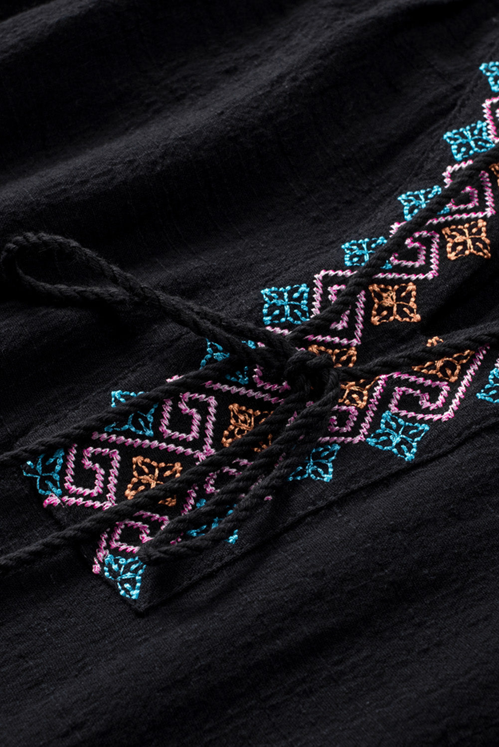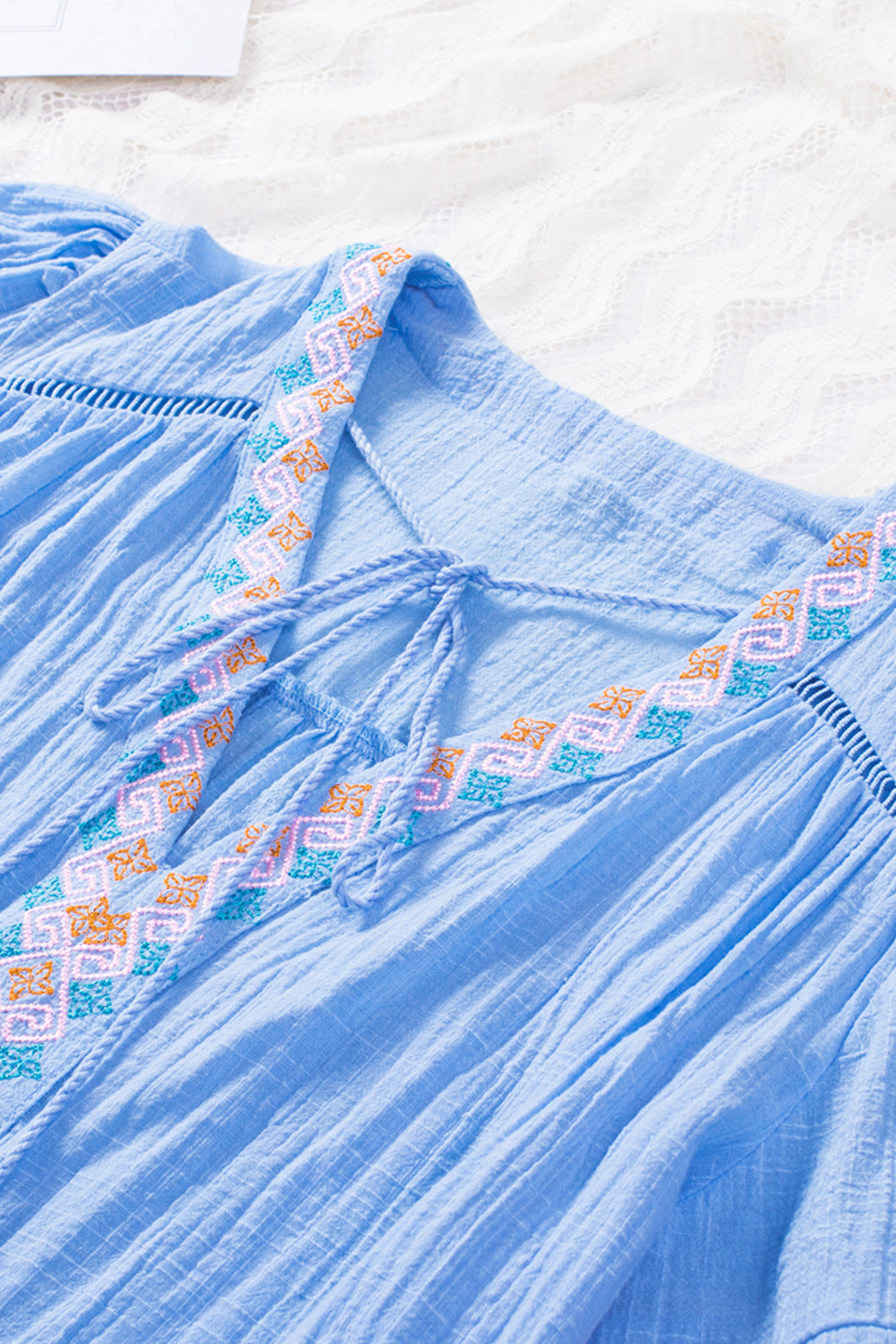 This Tassel Drawstring Embroidered Half Sleeve V Neck Top is the perfect addition to your wardrobe.