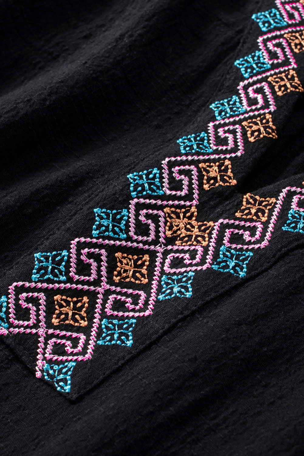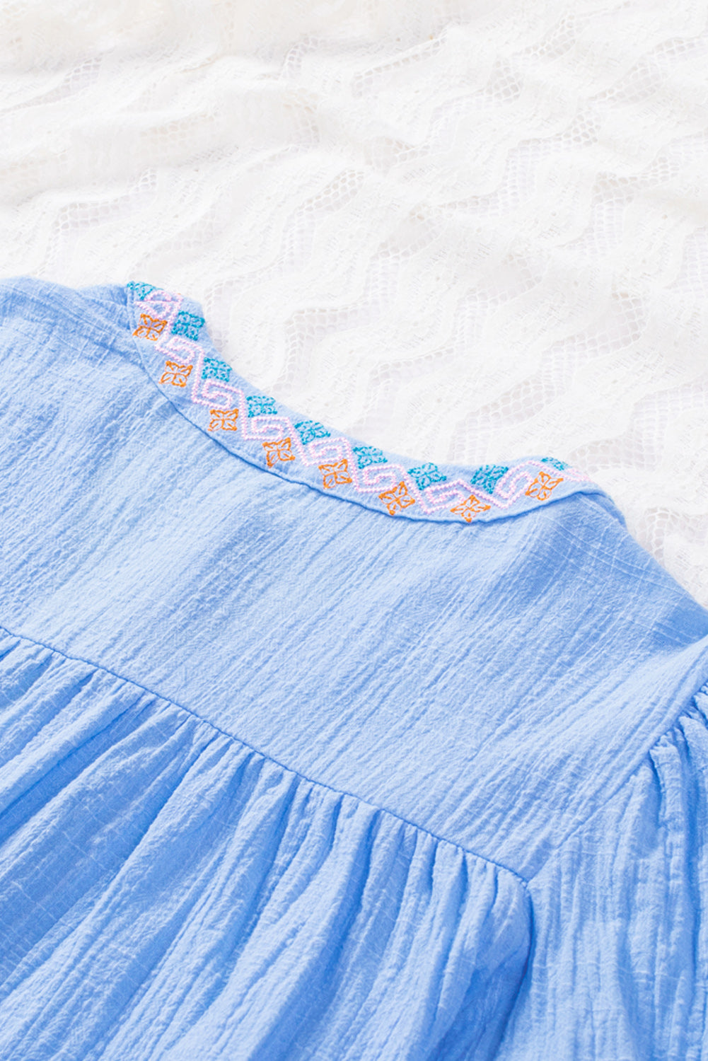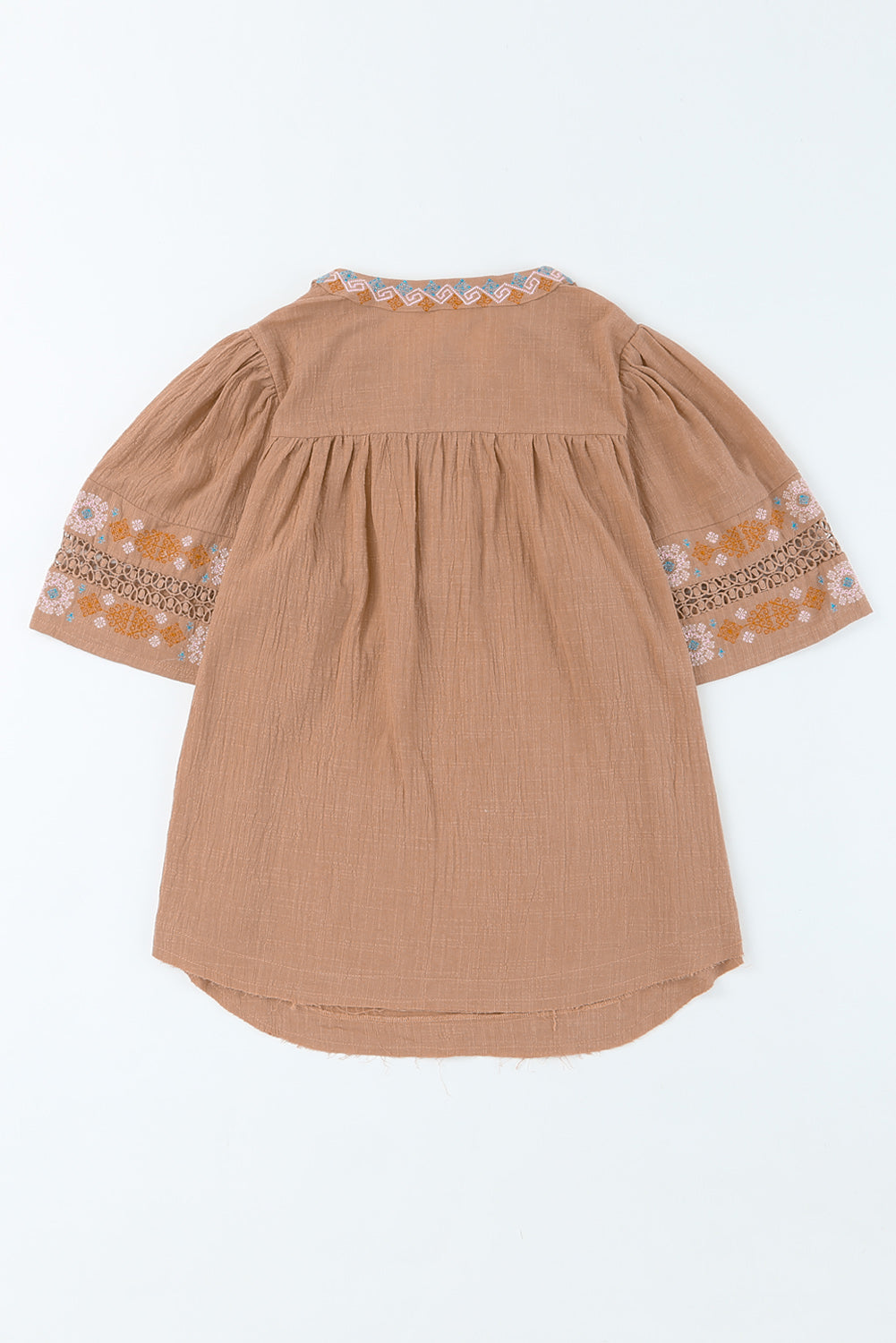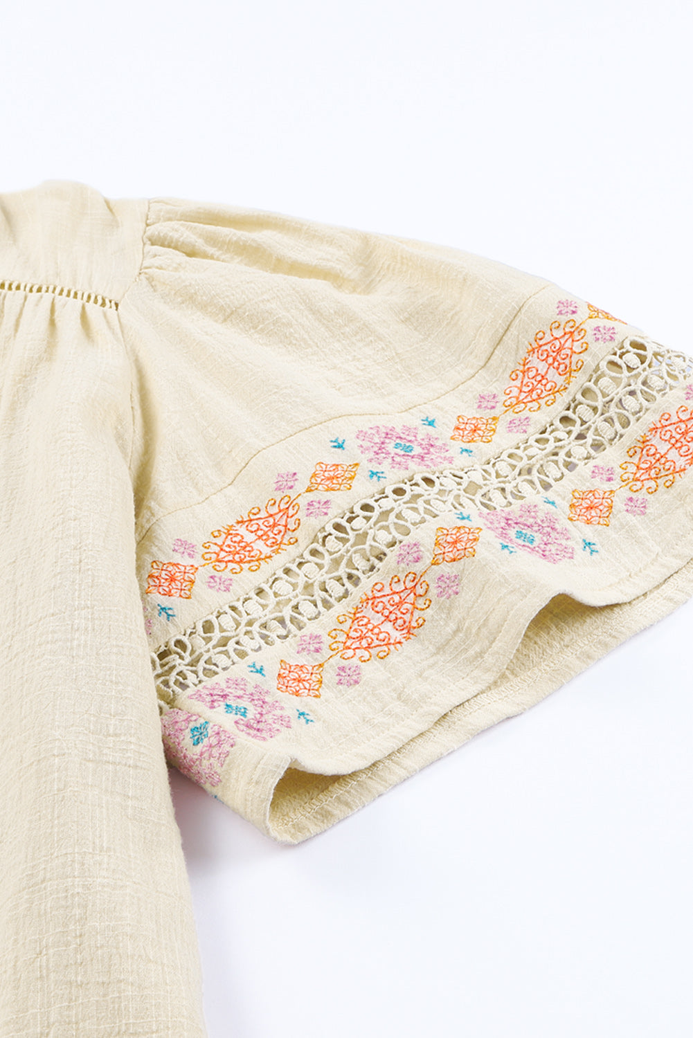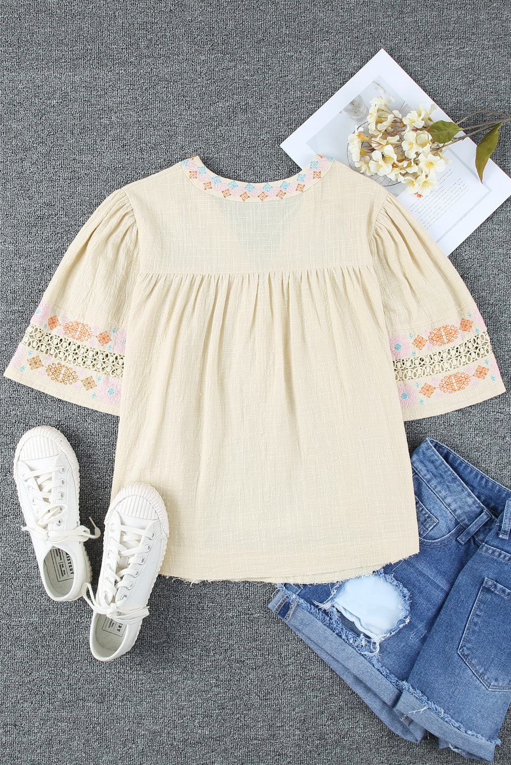 This Tassel Drawstring Embroidered Half Sleeve V Neck Top is the perfect addition to your wardrobe.