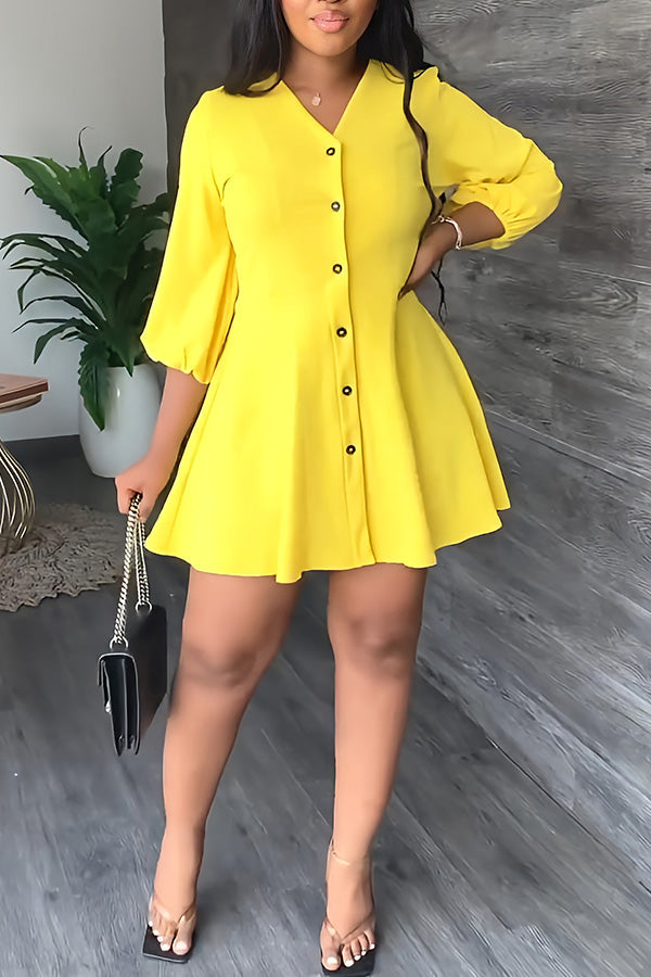 We're glad you've clicked on our new single breasted dress as we're really into its feminine vibes! The v neck and half sleeve cut make this a great choice for any stylish girl.