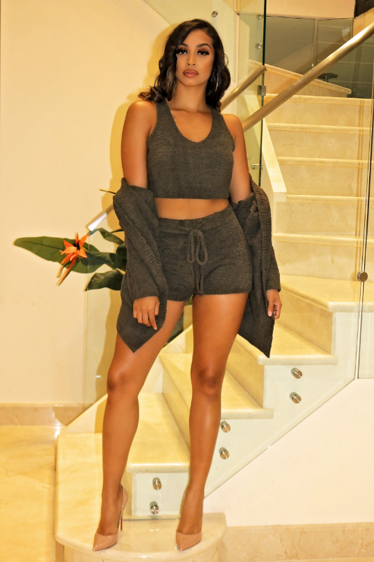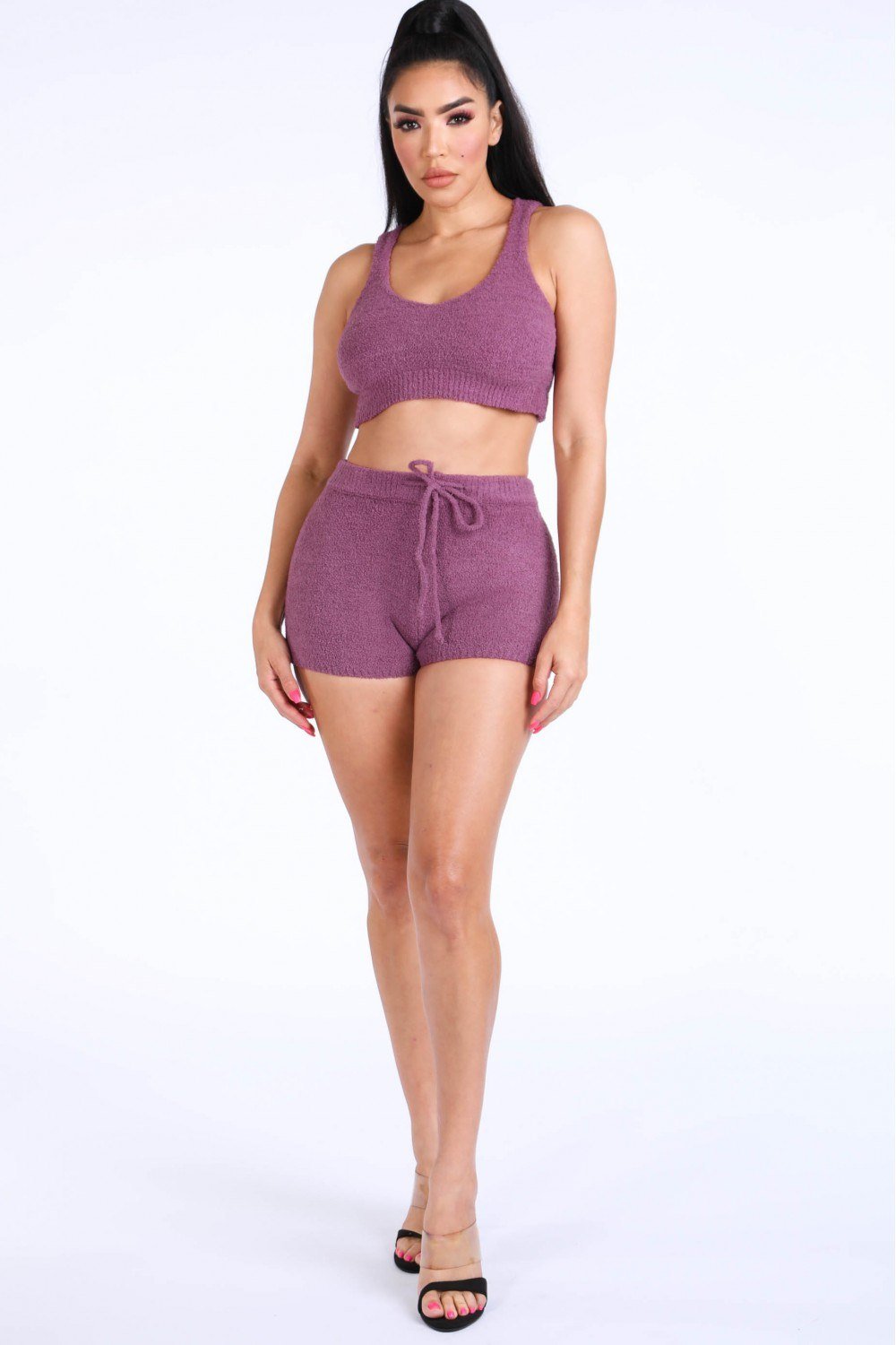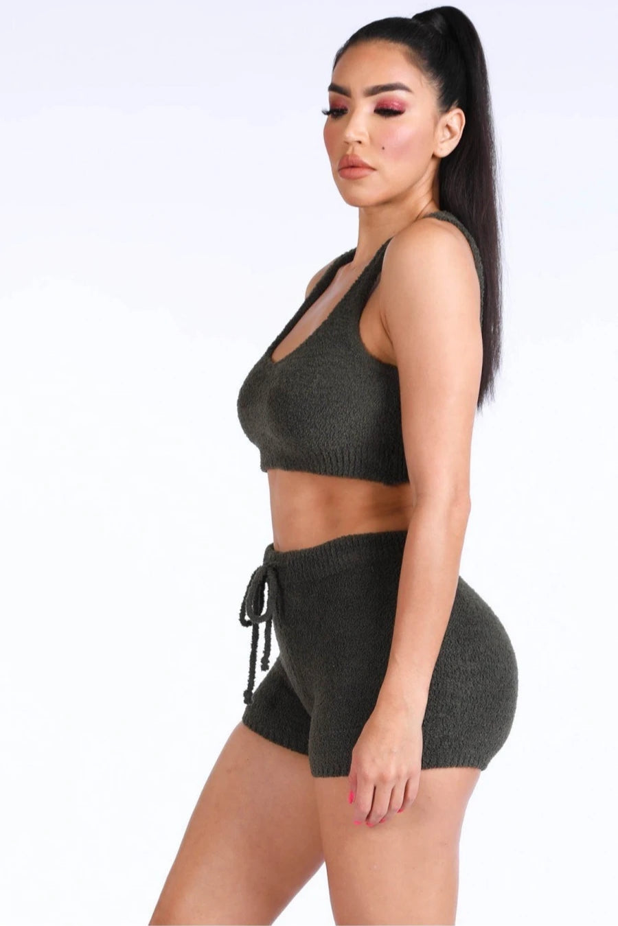 Textured Knitted Tank Top & Short Matching Set- Olive
