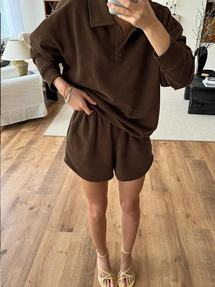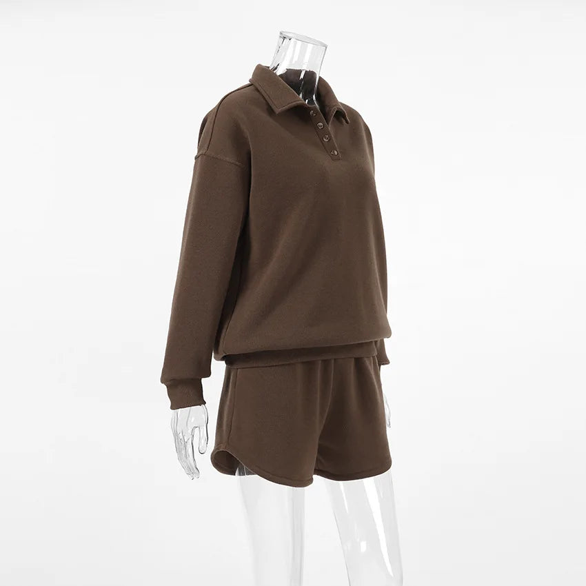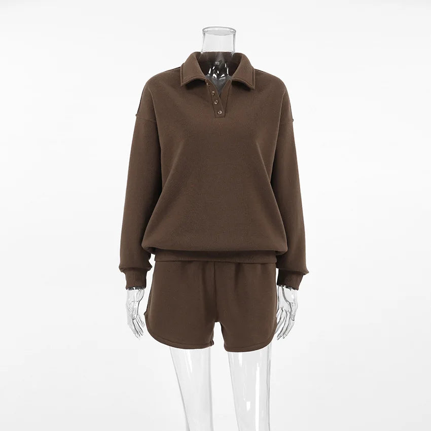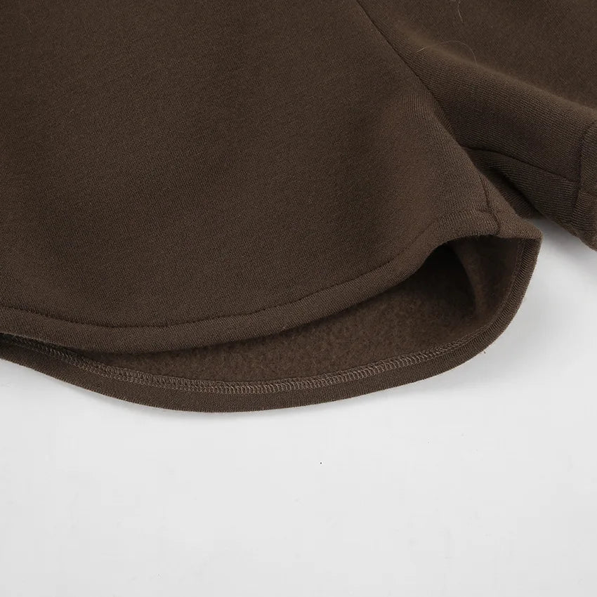 Whatever the occasion The Perfect Fit Two Piece Set is a must. Featuring a chocolate cotton hue material with a half zip-up design long sleeve sweatshirt and matching loose fitting shorts. Team with your favorite shoes and minimal accessories for a look that will win serious style points.