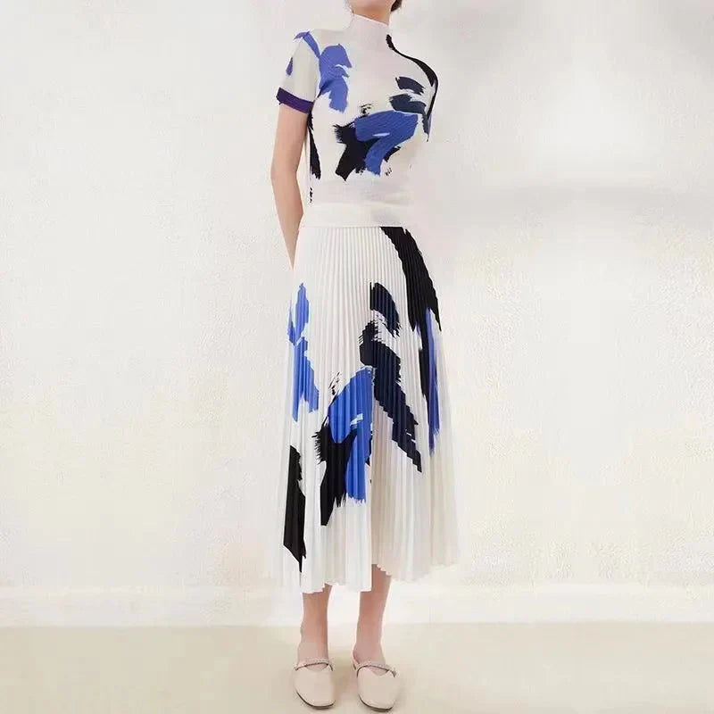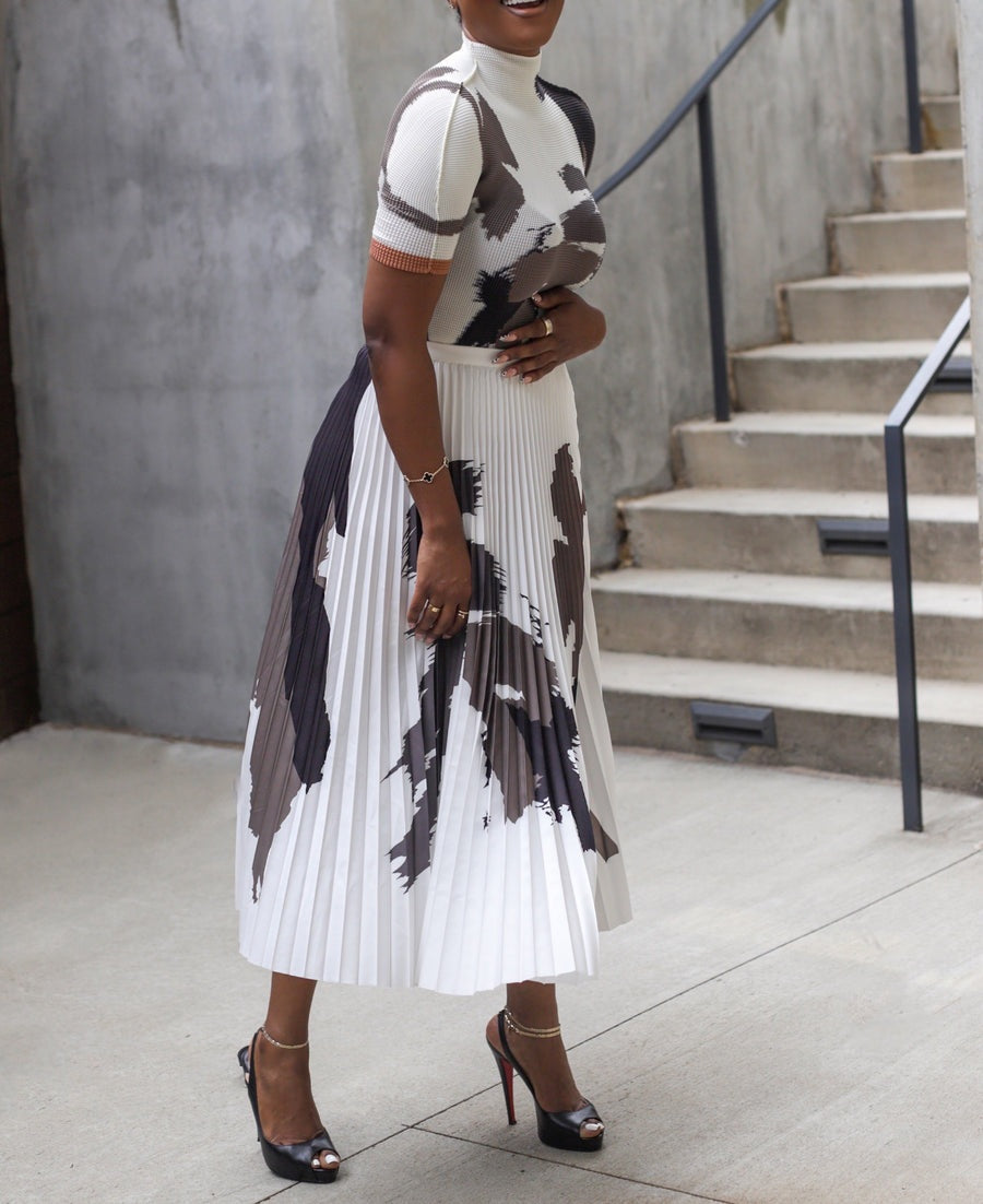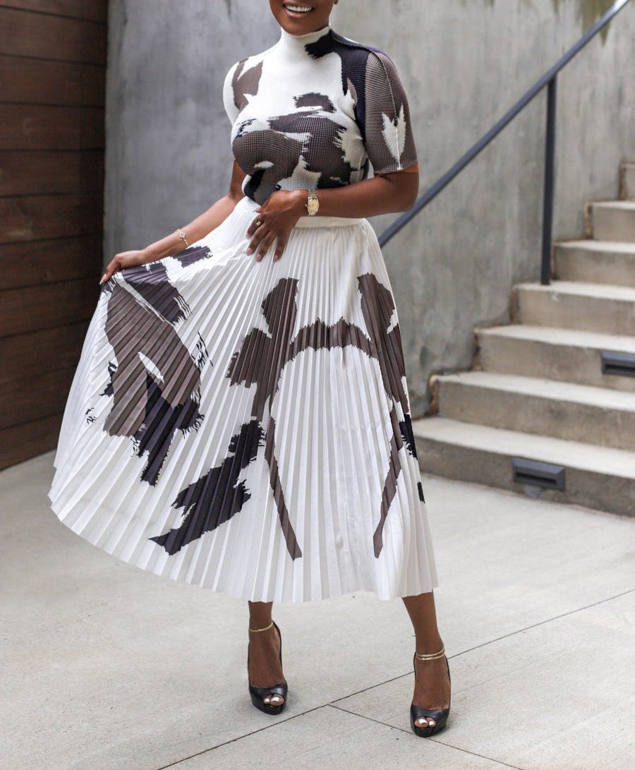 Scrunched Mock Neck Top with Coordinating Pleated Skirt