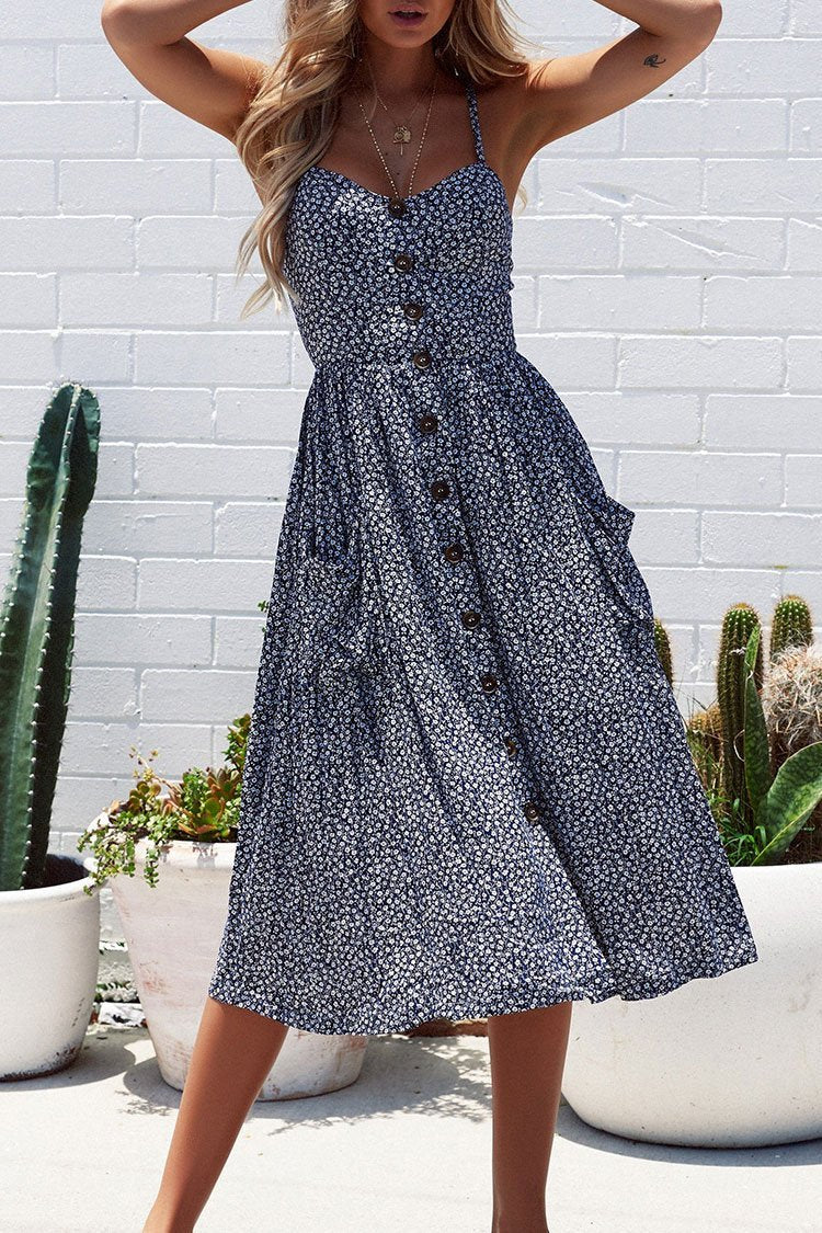 Bohemian midi dress featuring adjustable spaghetti shoulder straps. shirred back. oversize patch pockets. mini floral print. single-breasted front. and midi hem. perfect for your resort.