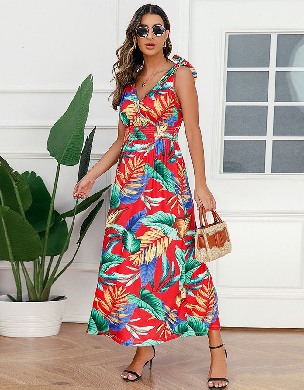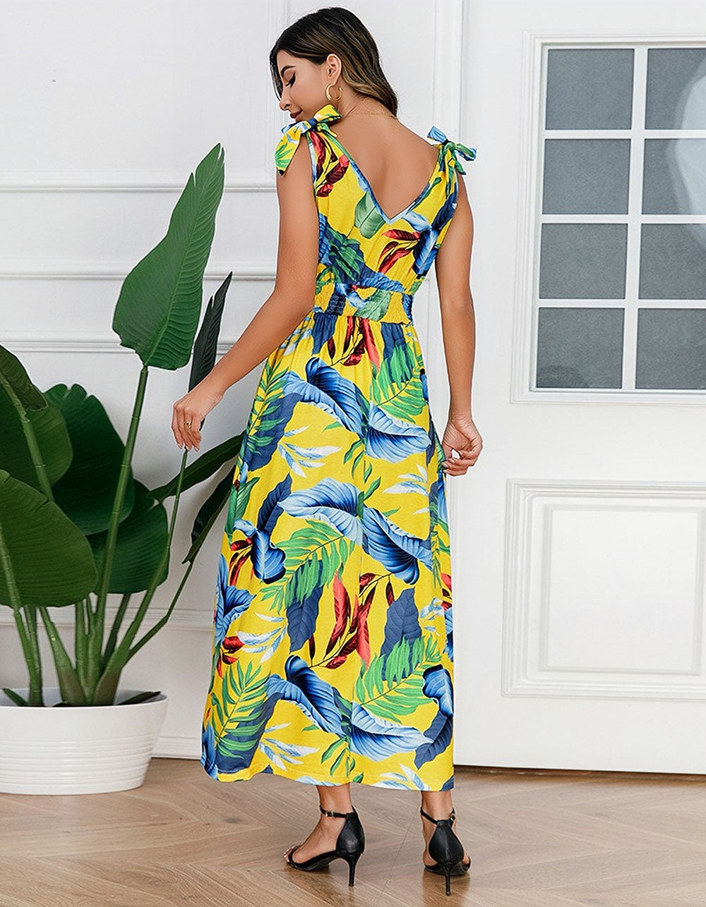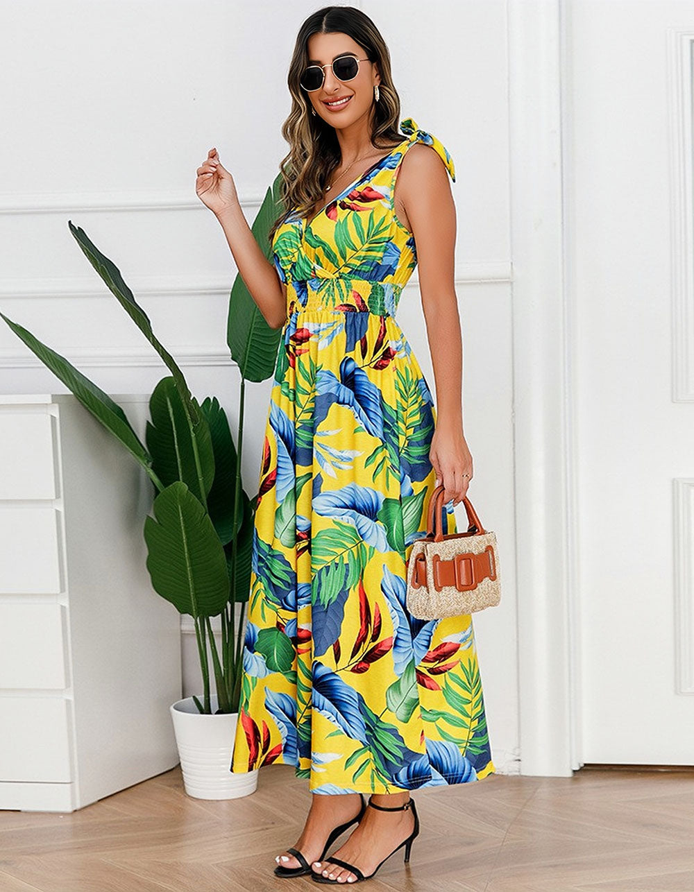 This stylishly-designed A-line dress is an ideal choice for all seasons. Constructed from lightweight. slightly-stretchy Polyester. it features a mid-waist trim. a backless design. and a ruffle hemline that will draw the eye. Available in 4 vibrant colors ï¿?Red. Blue. Yellow. and Black - and 3 distinct styles. Cute. Elegant. and Casual. this dress is sure to make a statement. Its unique Plant print adds a chic touch of sophistication.