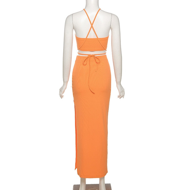 This Twisted Cut Out Skirt Set is sure to turn heads this season. Featuring a bright orange stretch material with a wraparound crop top and a maxi skirt length with high leg split. we're obsessed. Pair this with a mini bag for a brunch-worthy combo.