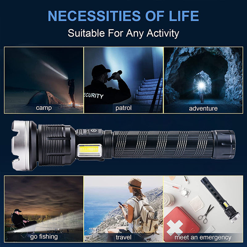 Imagine having the power to light up the night like never before. This tactical flashlight is not just another tool. it is your beacon in the dark. guiding you through the unknown with an unmatched brightness of 90.000 lumens. Compact yet powerful. it is your reliable companion for any adventure.