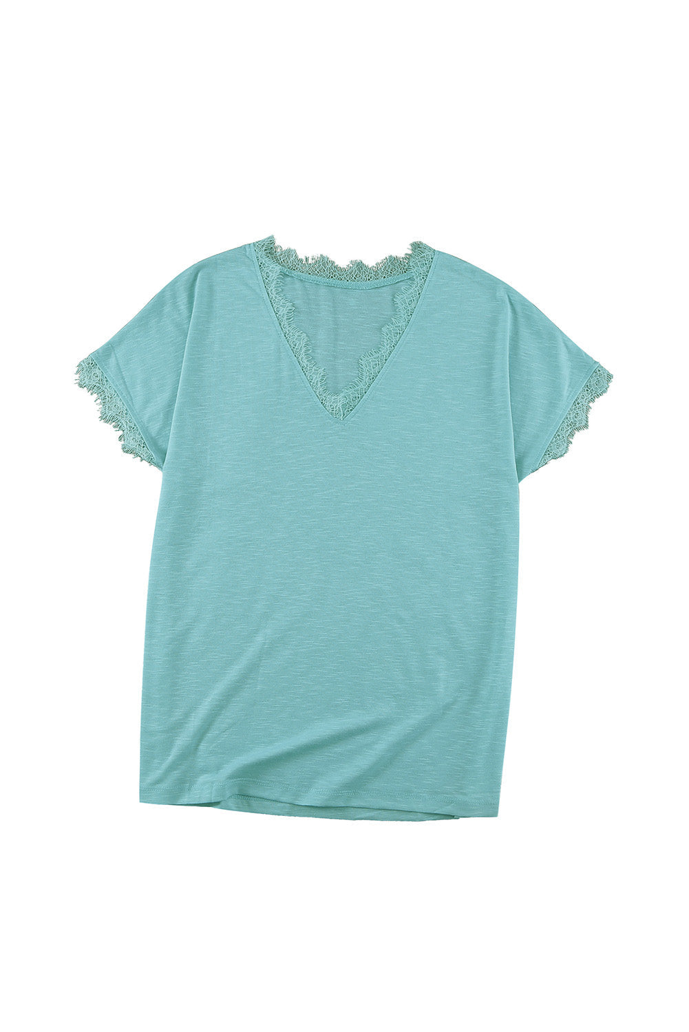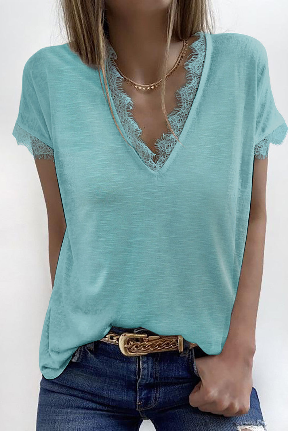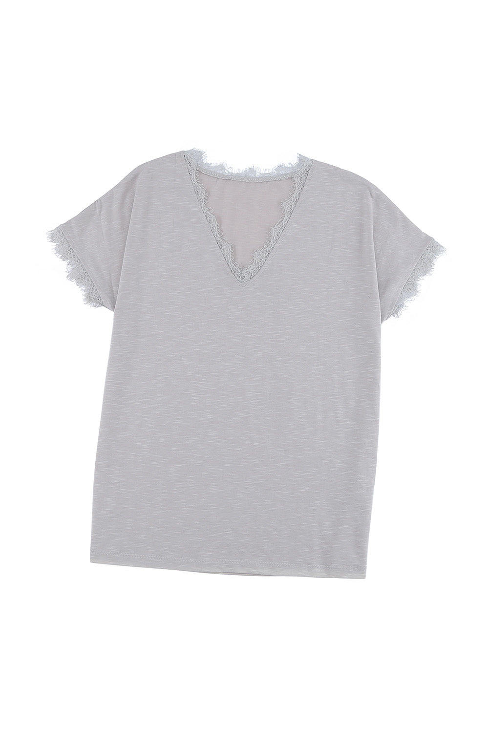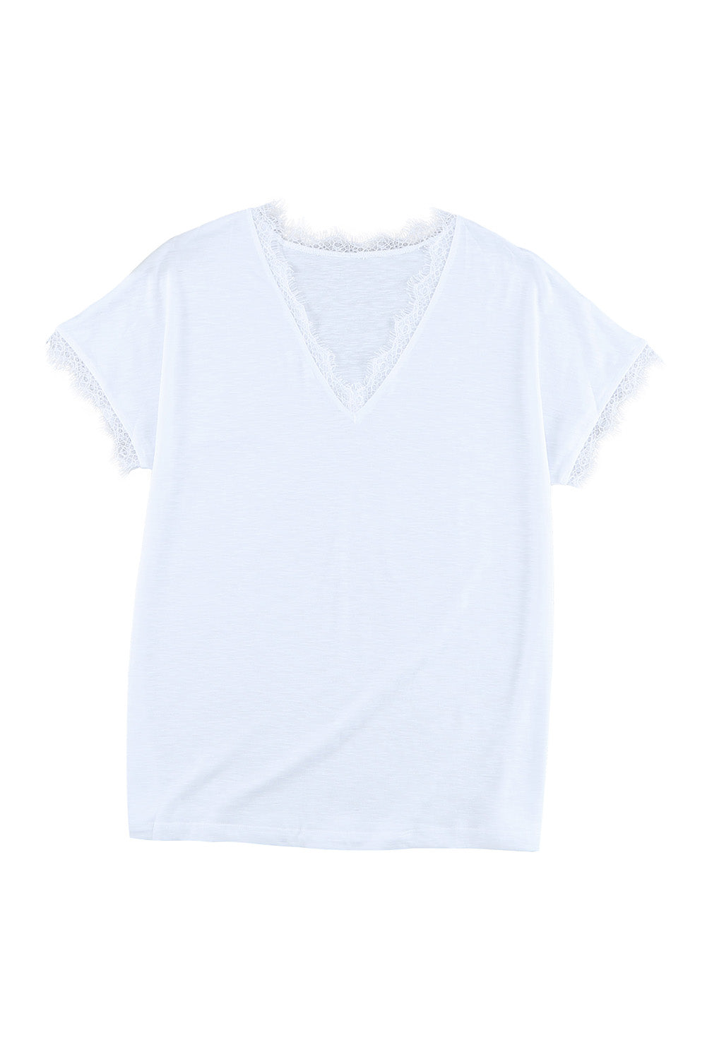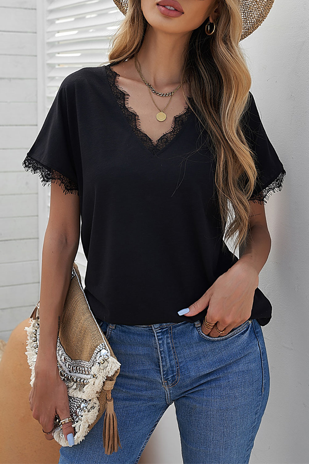 This V Neck Lace Trim Short Sleeve Top is the perfect addition to your wardrobe.