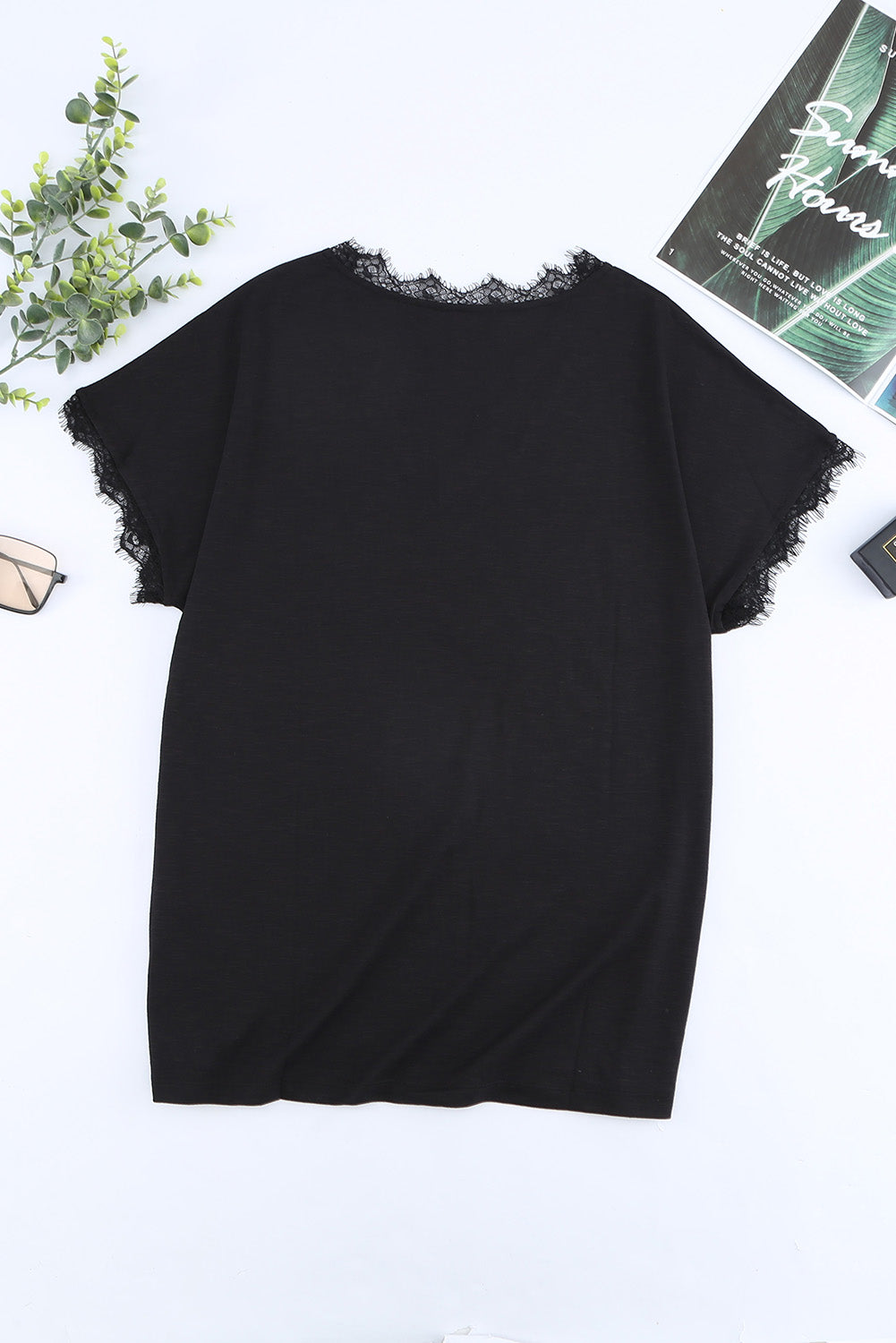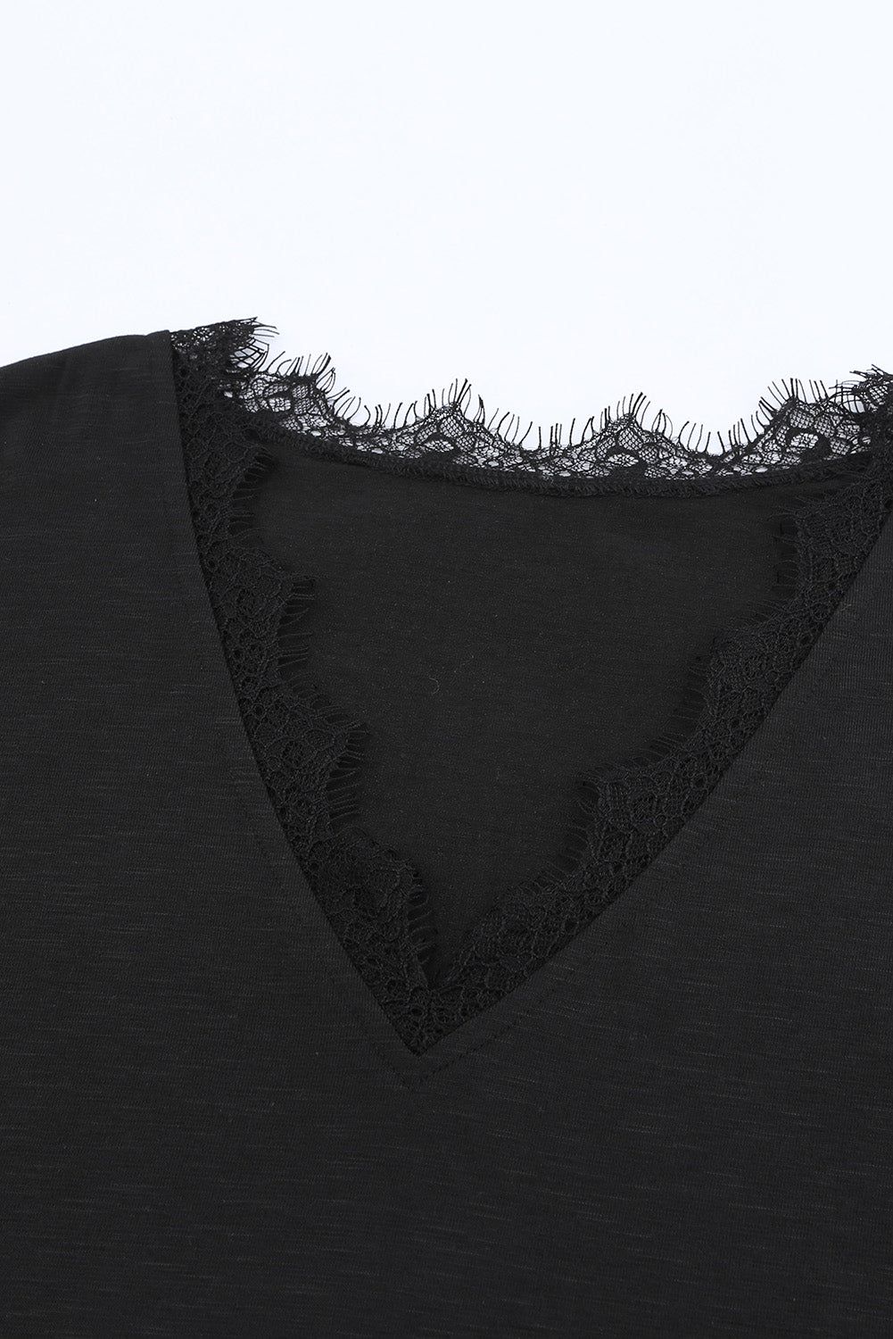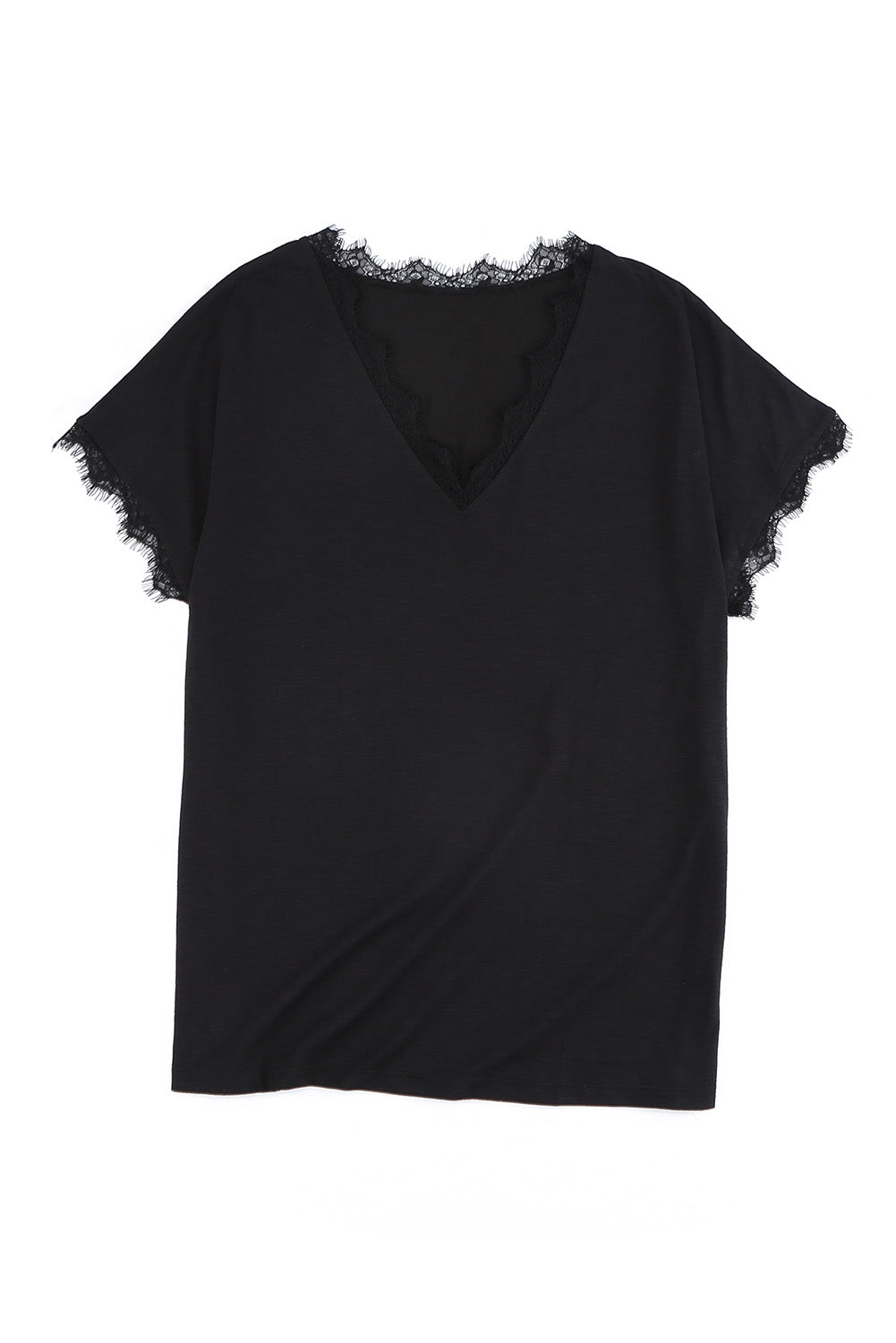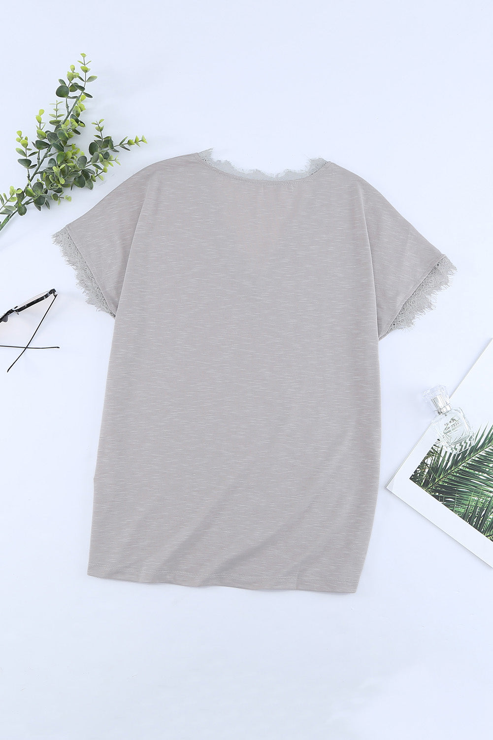 This V Neck Lace Trim Short Sleeve Top is the perfect addition to your wardrobe.