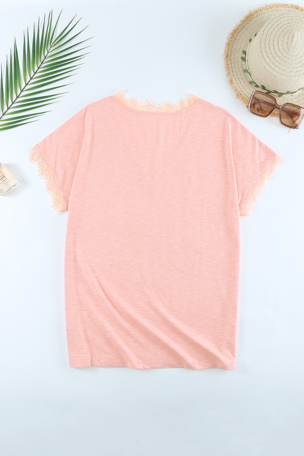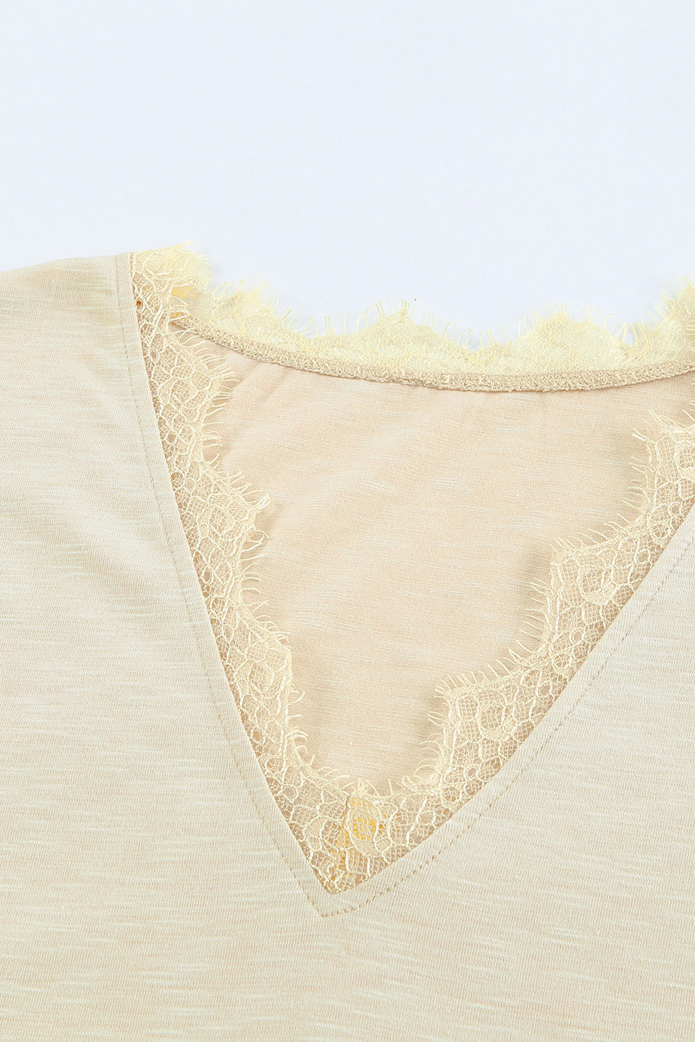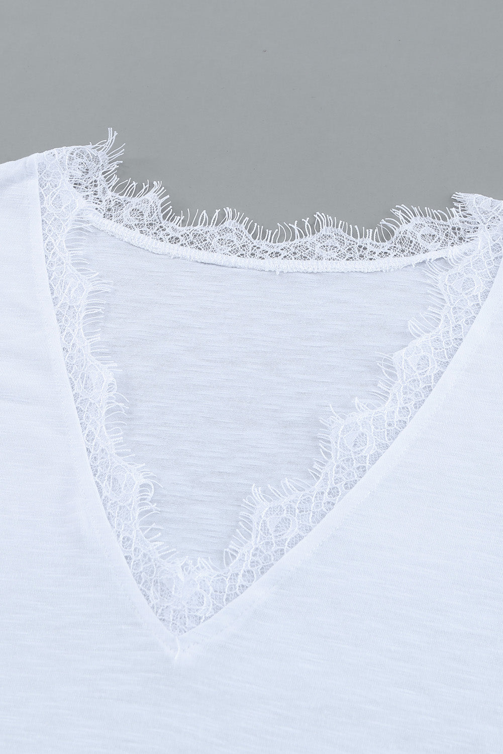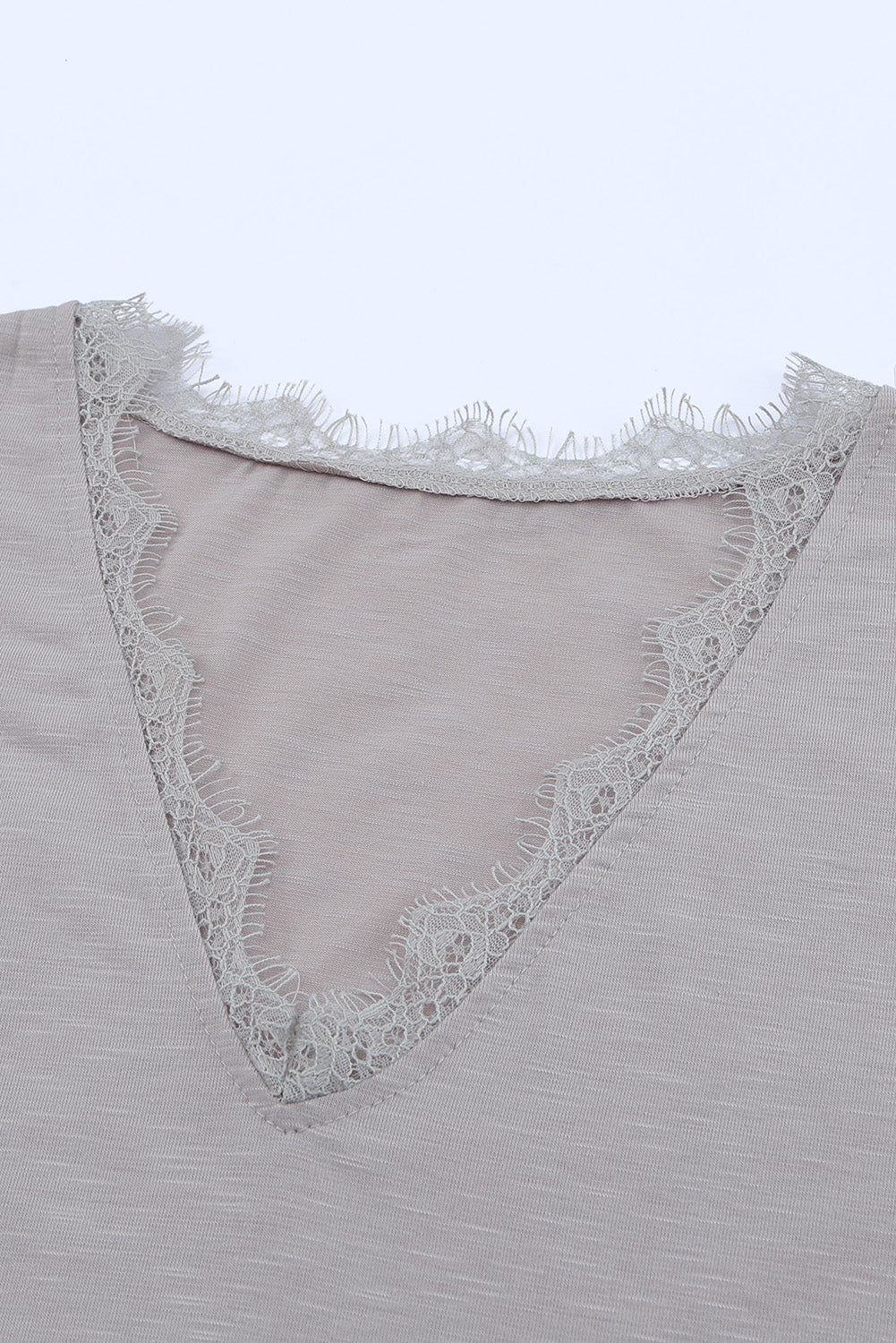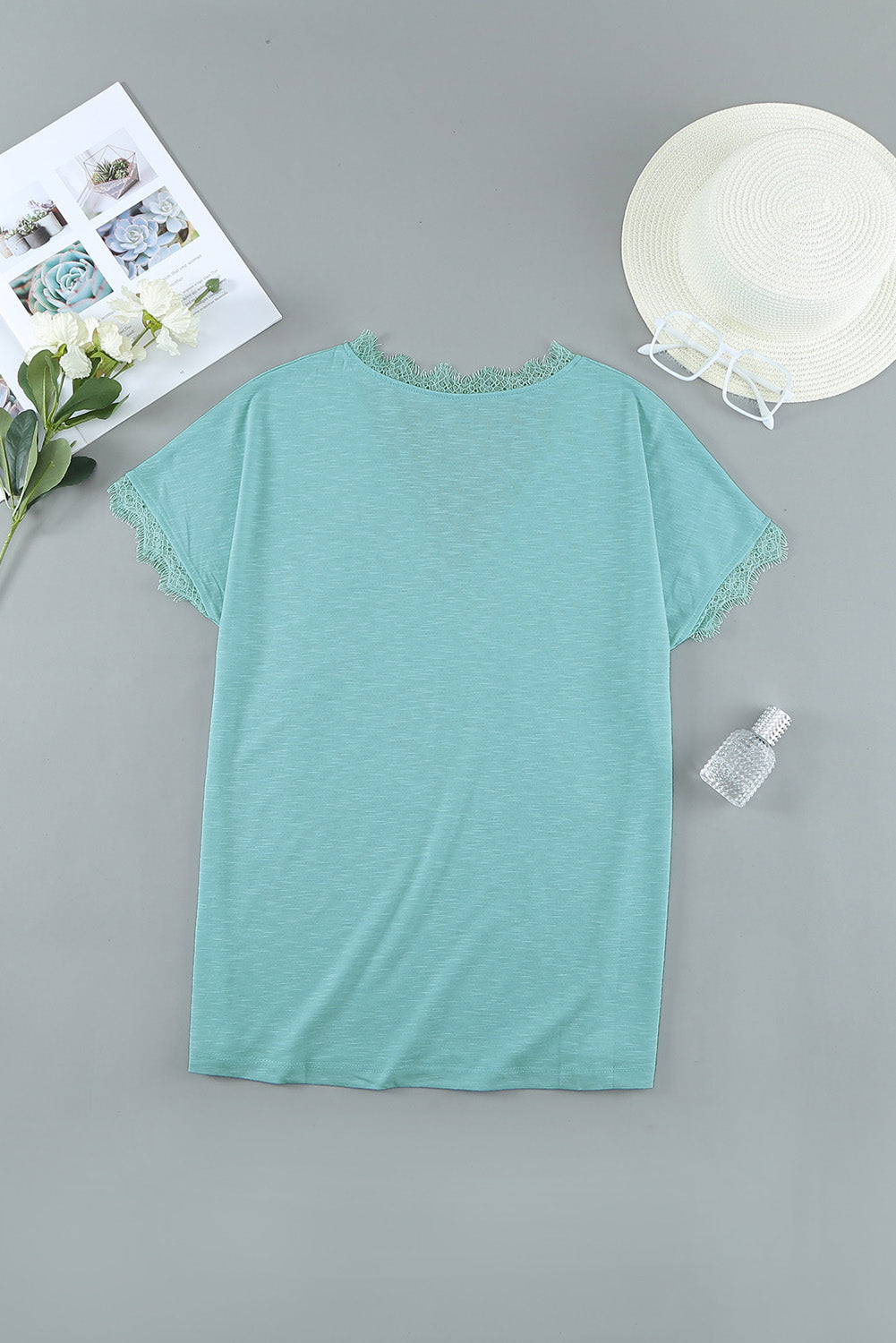 This V Neck Lace Trim Short Sleeve Top is the perfect addition to your wardrobe.