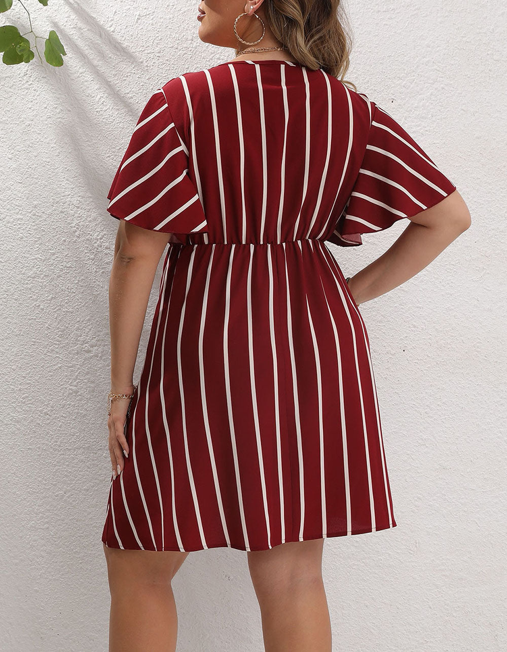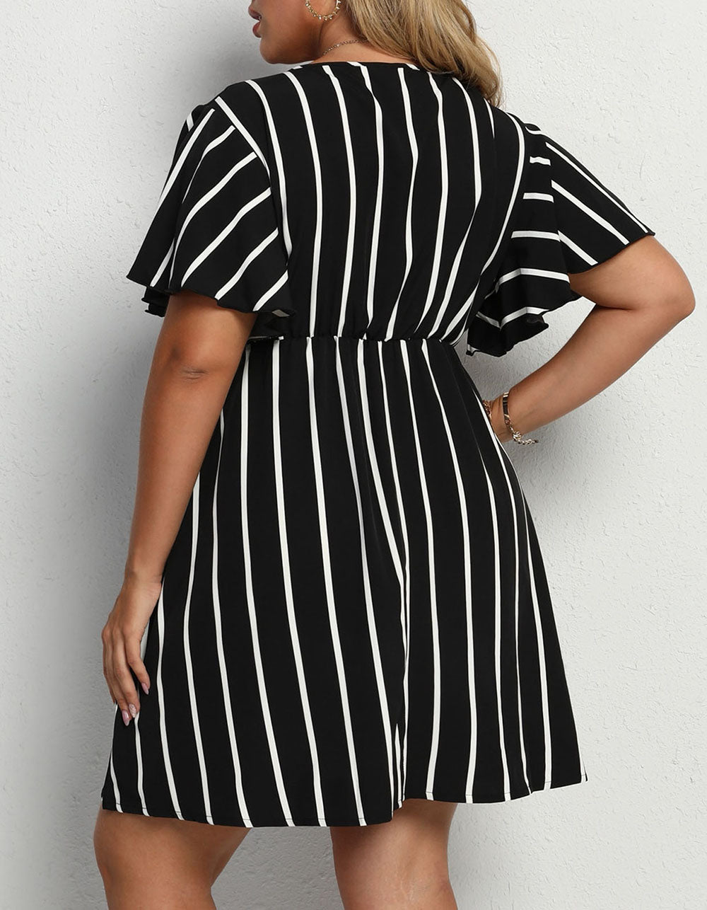 This V Neck Plus Size Striped Loose Short Sleeve A-Line Dress is designed for maximum comfort and flattering fit. It features a striped pattern with a printed detail and a V neckline for an elegant look. The dress is made of polyester with a slight stretch and has a high-waisted A-line fit. short ruffle hem. and regular short sleeves for a comfortable and stylish look.
