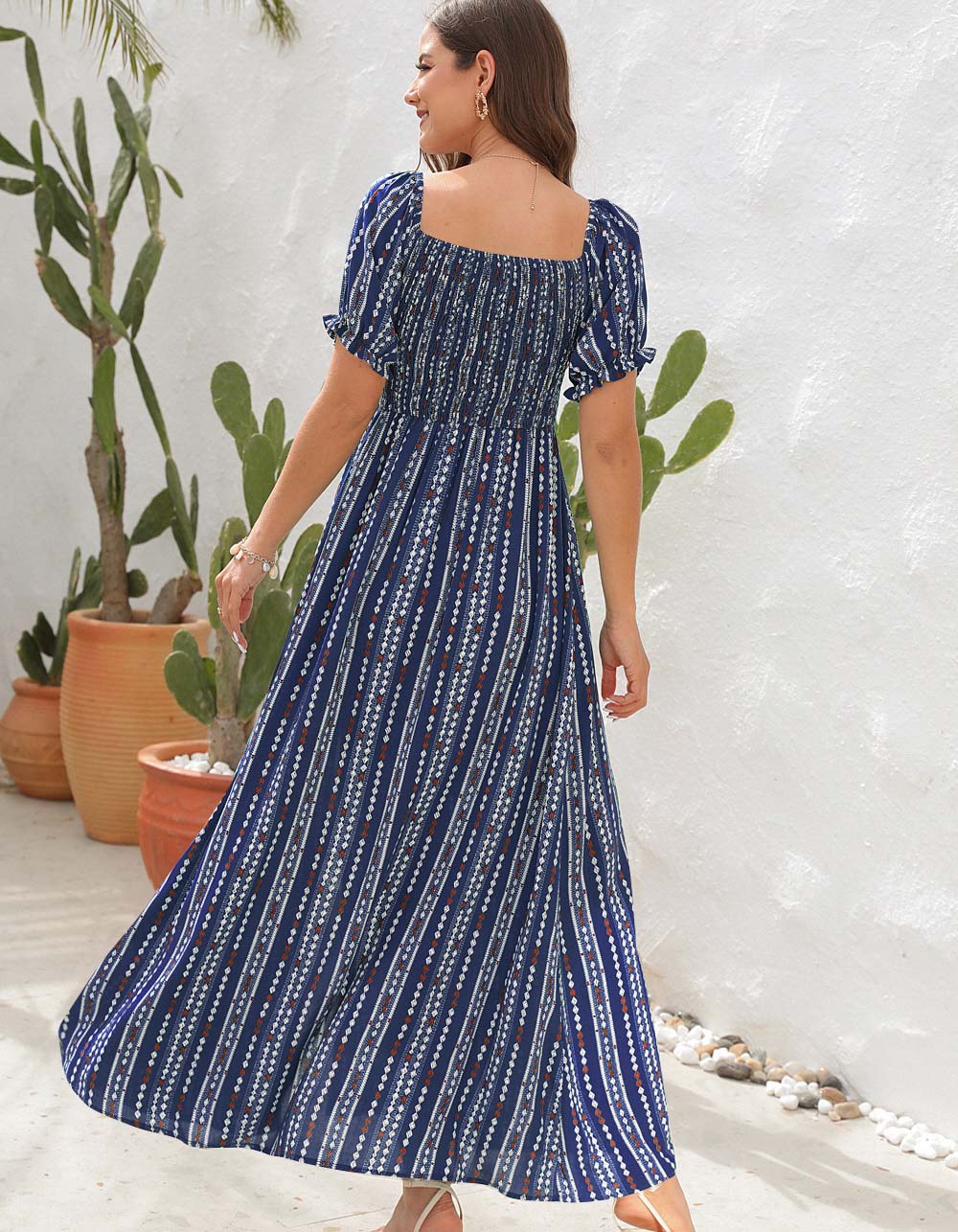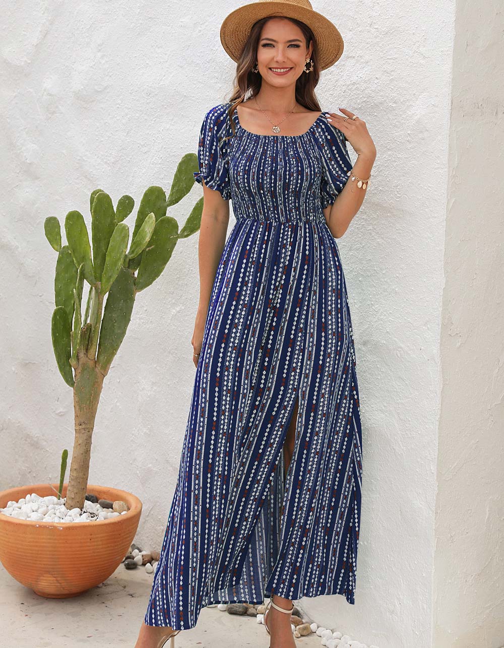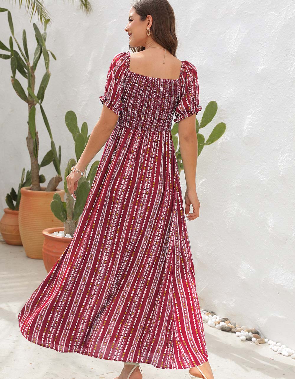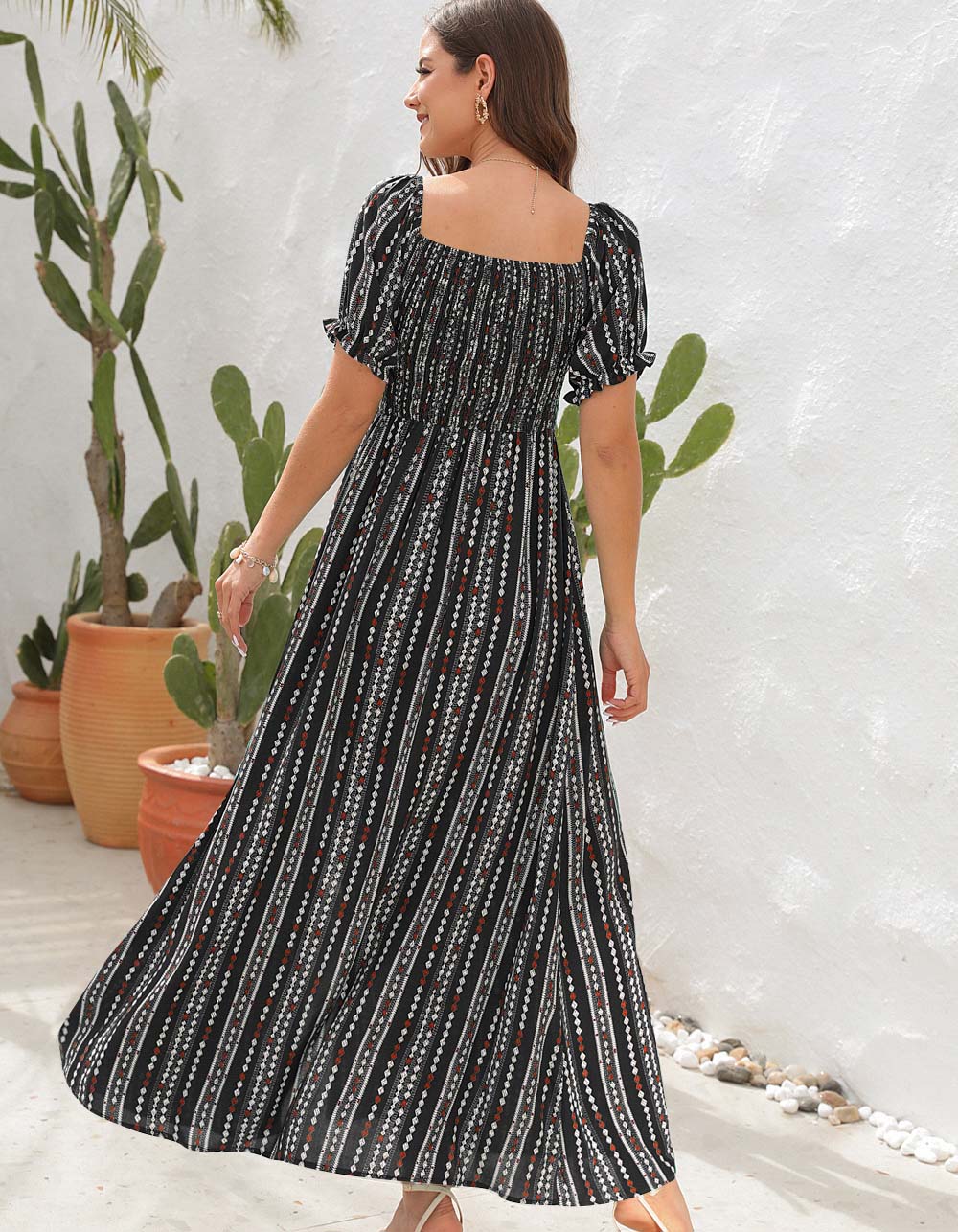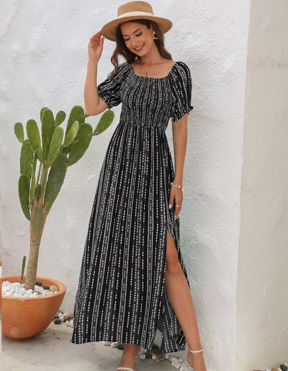 This fashionable dress features a vertical stripe print and slits that add stylish detail. It has a square neckline. short puff sleeves. and a high waist that creates an A-line silhouette. Made from a lightweight and slightly stretchy Polyester material. this dress is sure to make a statement with its cute. casual. and elegant elements.
