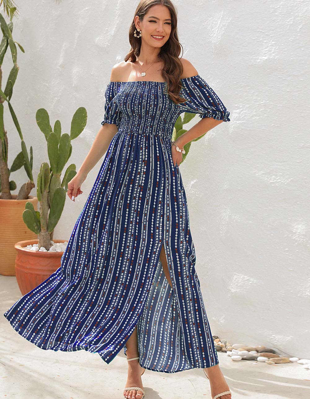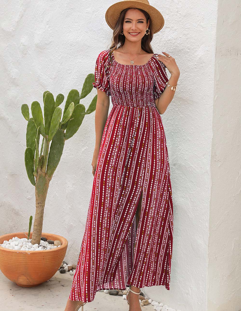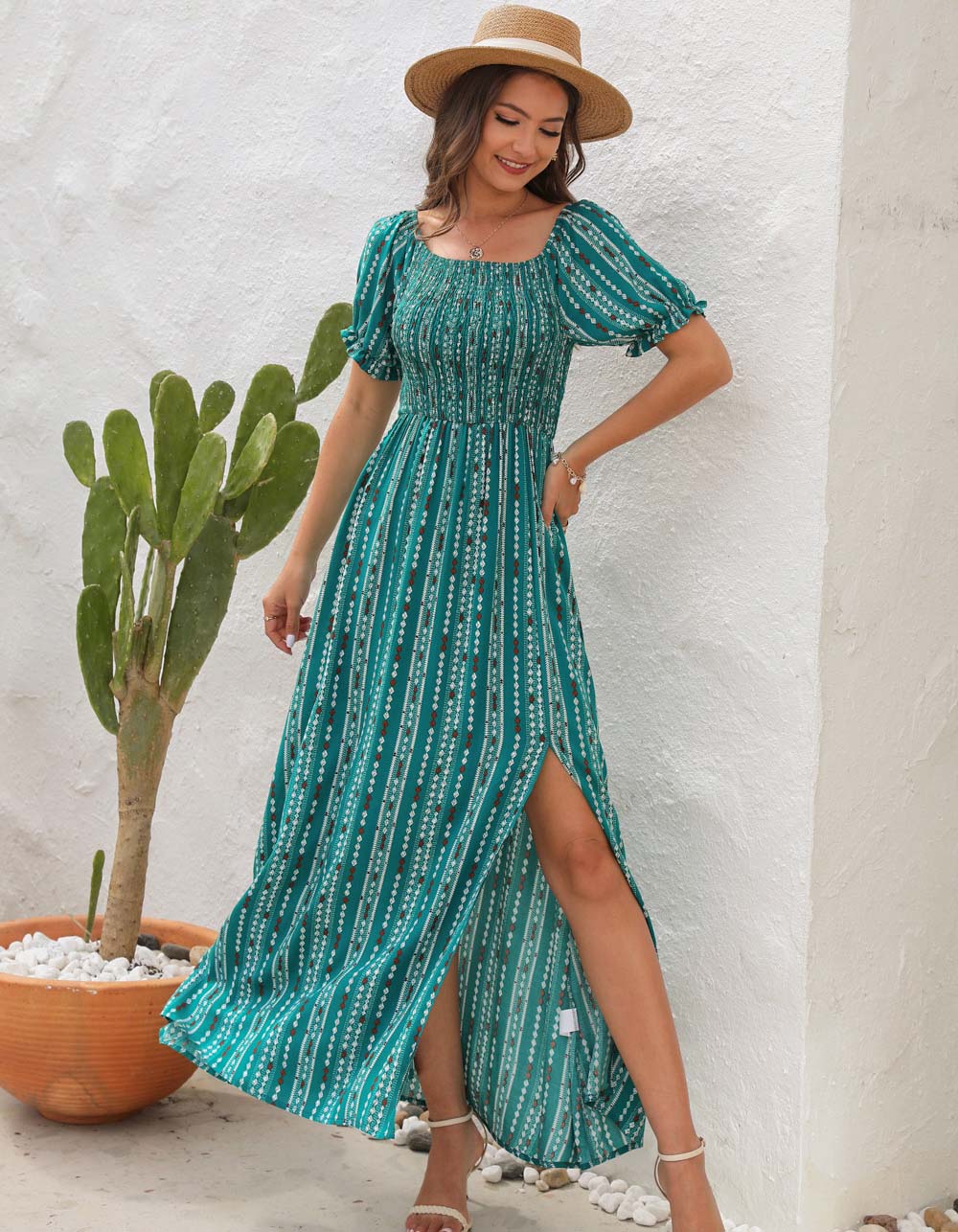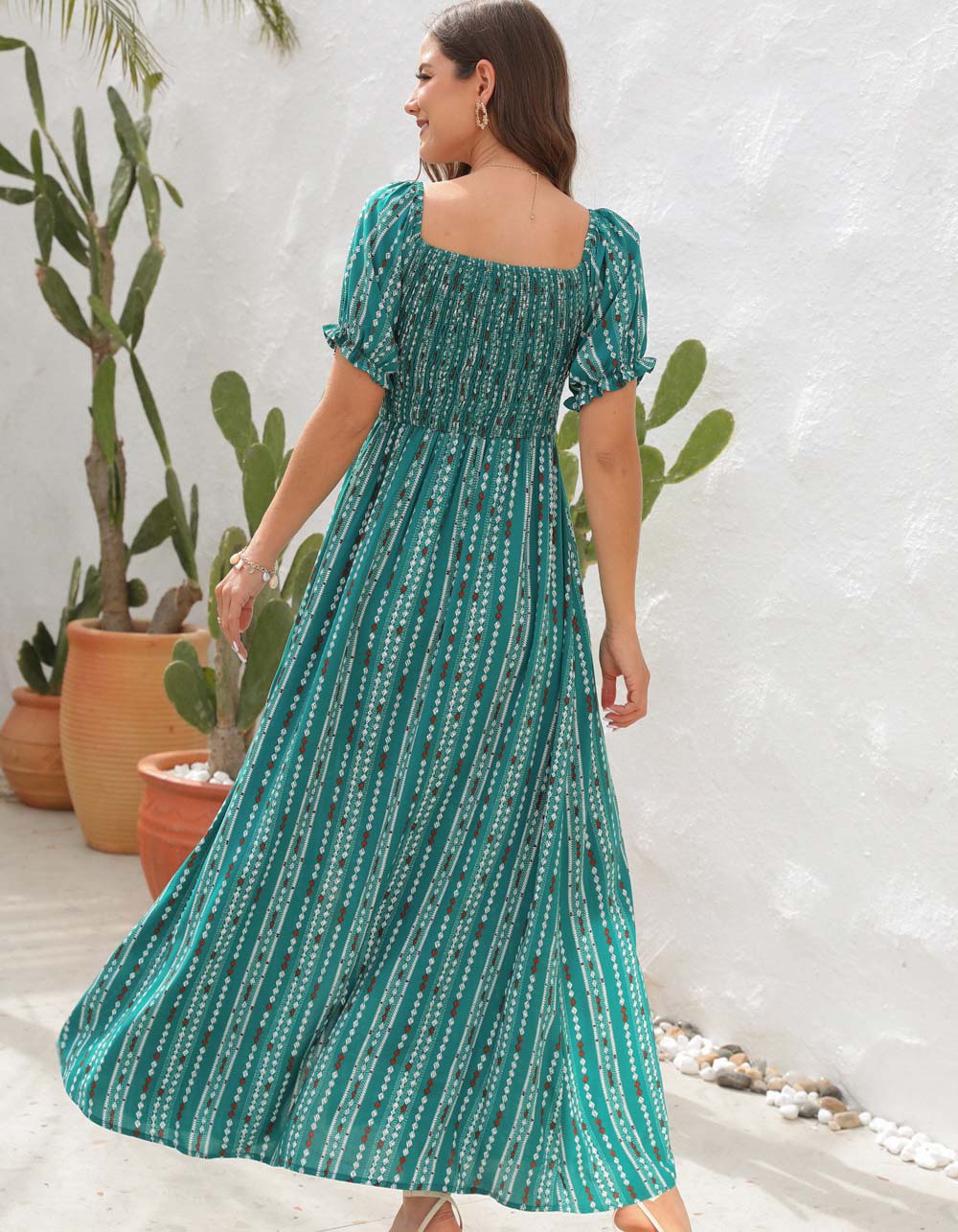 This fashionable dress features a vertical stripe print and slits that add stylish detail. It has a square neckline. short puff sleeves. and a high waist that creates an A-line silhouette. Made from a lightweight and slightly stretchy Polyester material. this dress is sure to make a statement with its cute. casual. and elegant elements.