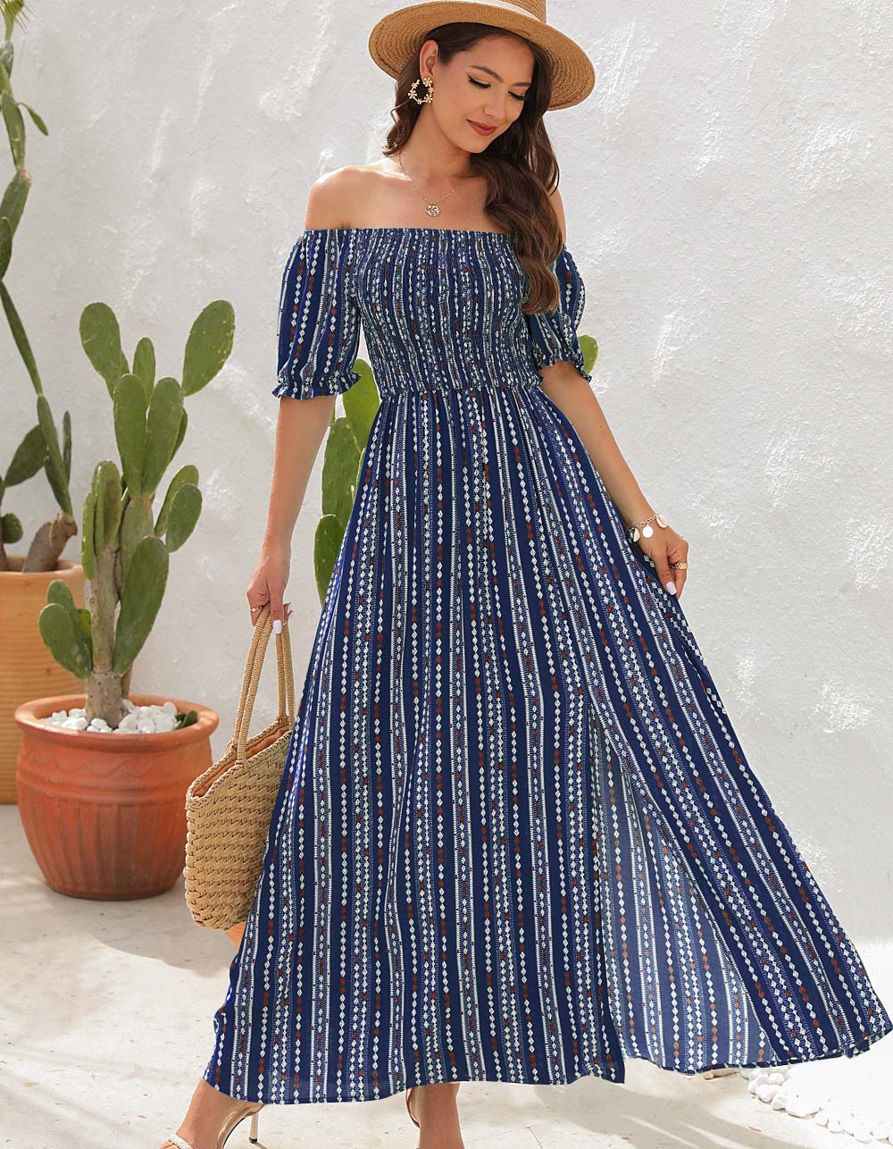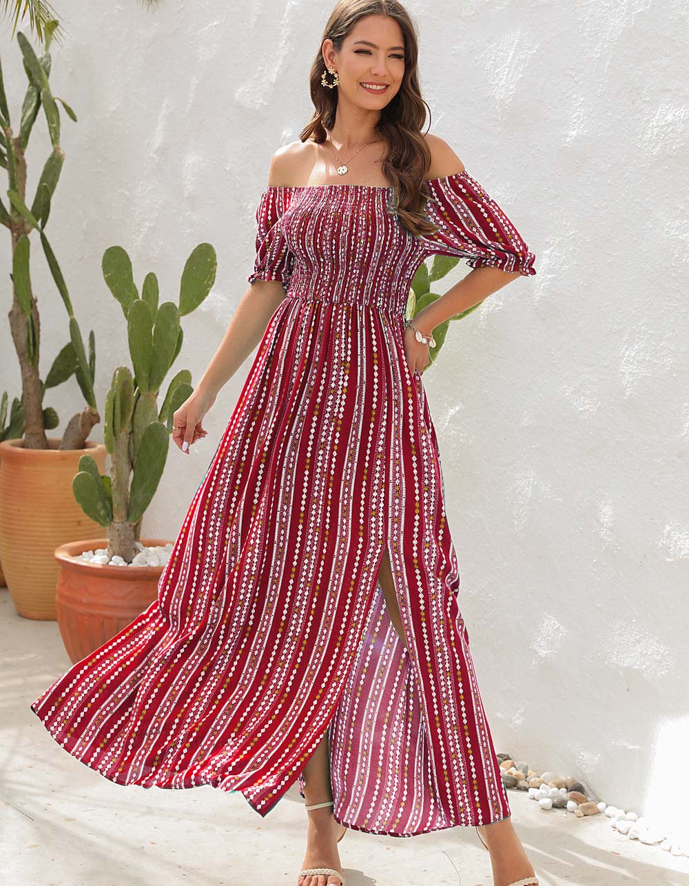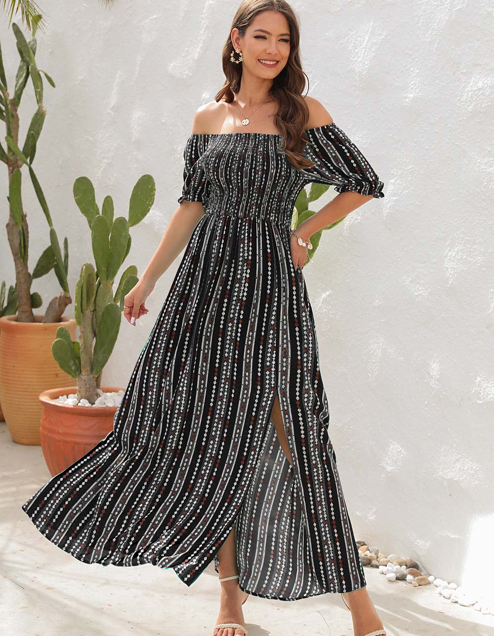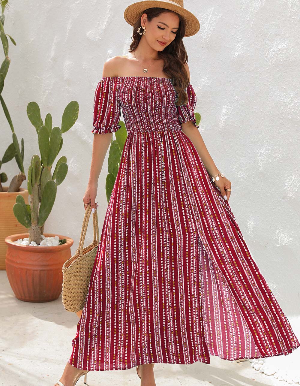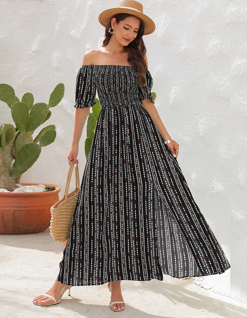 This fashionable dress features a vertical stripe print and slits that add stylish detail. It has a square neckline. short puff sleeves. and a high waist that creates an A-line silhouette. Made from a lightweight and slightly stretchy Polyester material. this dress is sure to make a statement with its cute. casual. and elegant elements.