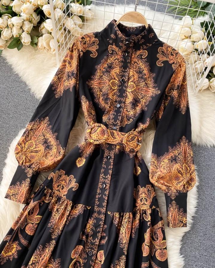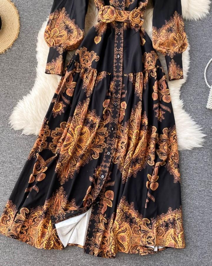 Vintage All Over Print Long Sleeve Maxi Dress With Belt