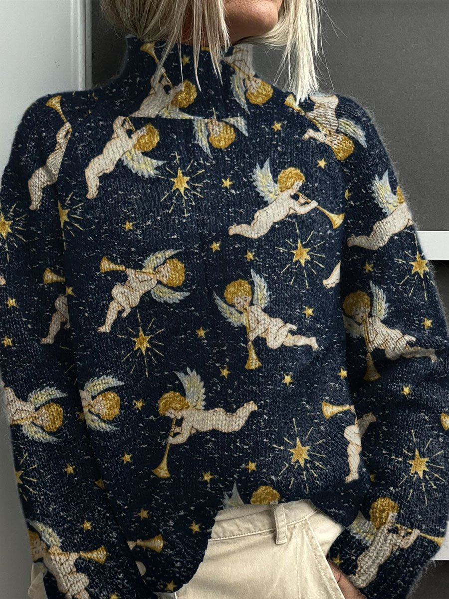 Vintage Christmas Angels Print Knit Turtleneck Pullover Sweater