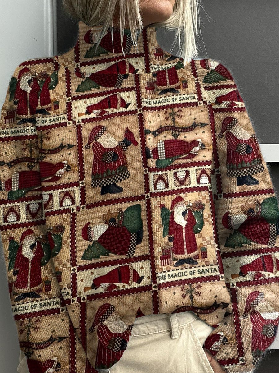 Vintage Christmas Print Knit Turtleneck Pullover Sweater