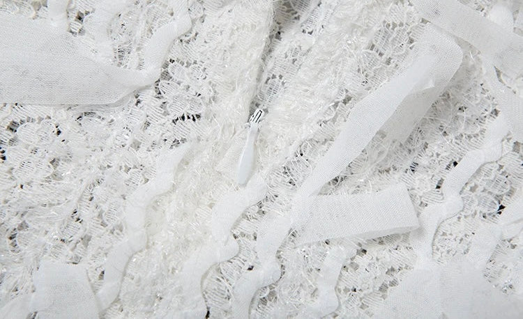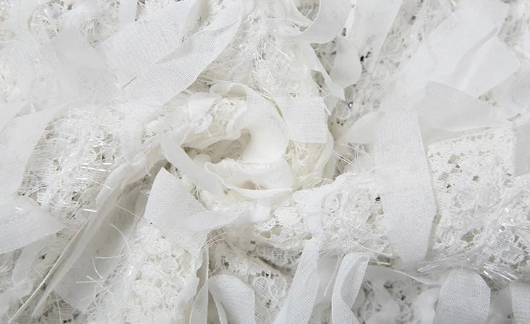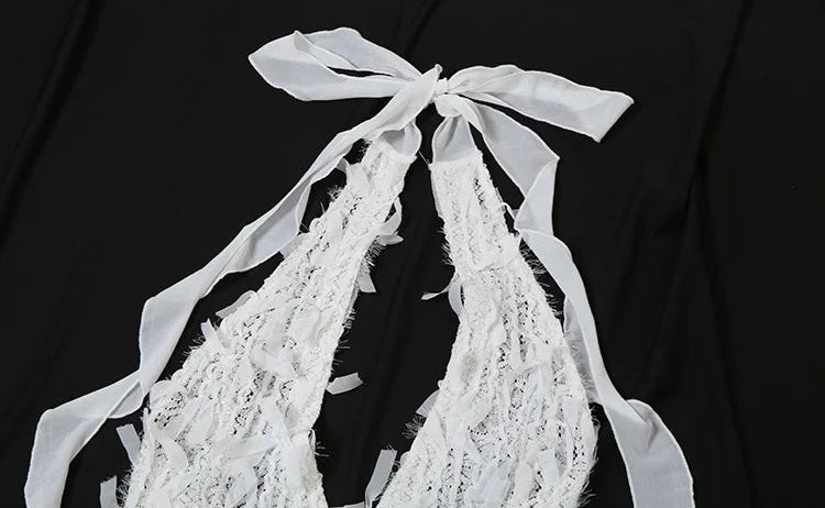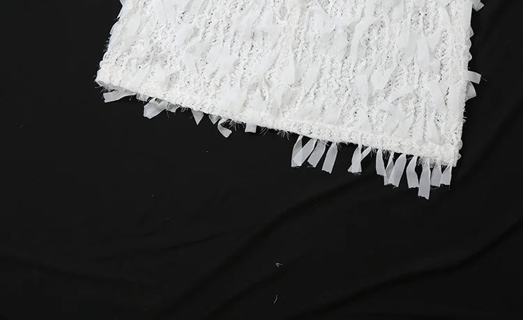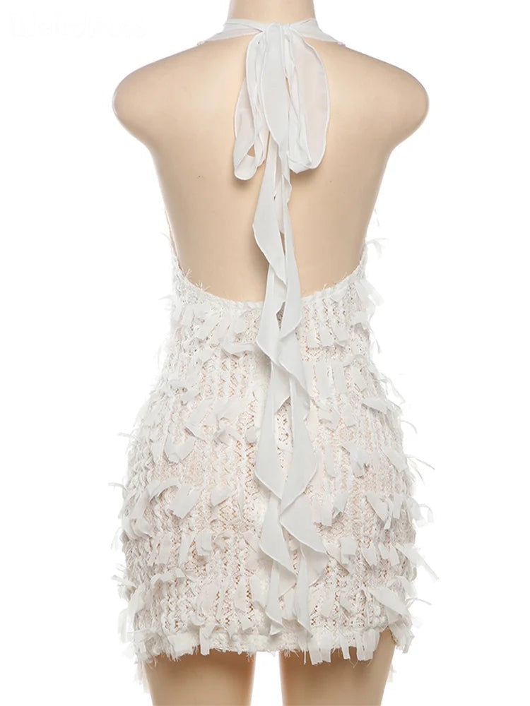 Up your all-in-one game with this White Affaire Fringe Mini Dress. Featuring a halter neck and thigh skimming length with an all over fringe design. it's sure to get you noticed. Team it with some strappy heels for a dreamy look.