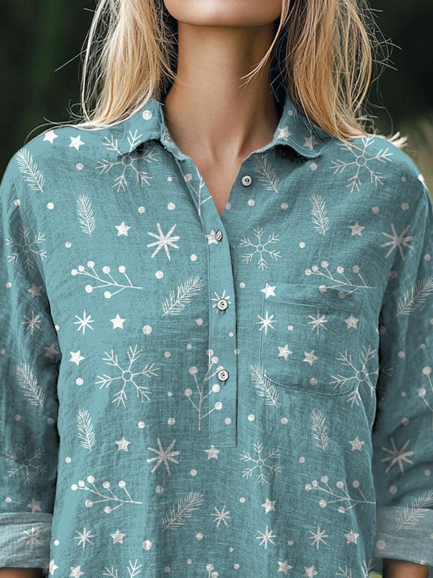 Winter Season Snowflake Pattern Printed Casual Cotton And Linen Shirt