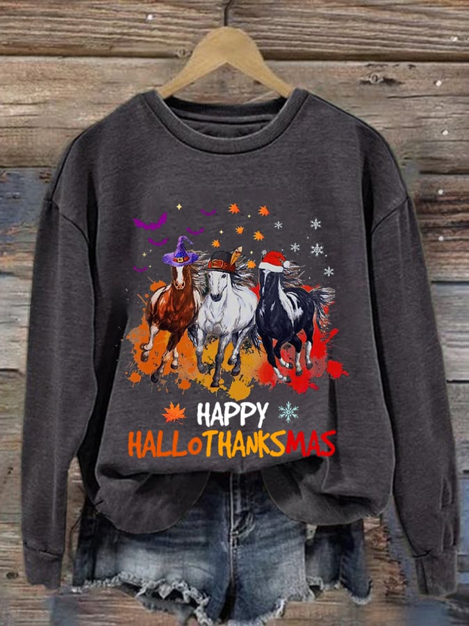 Casual Happy Hallothankmas Print Long Sleeve Sweatshirt