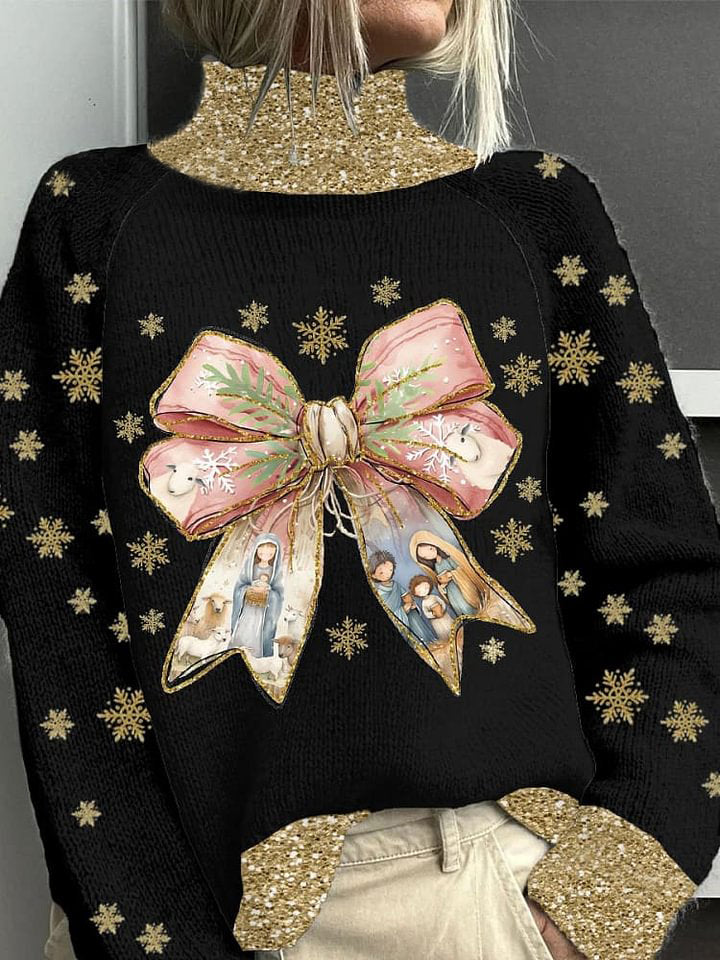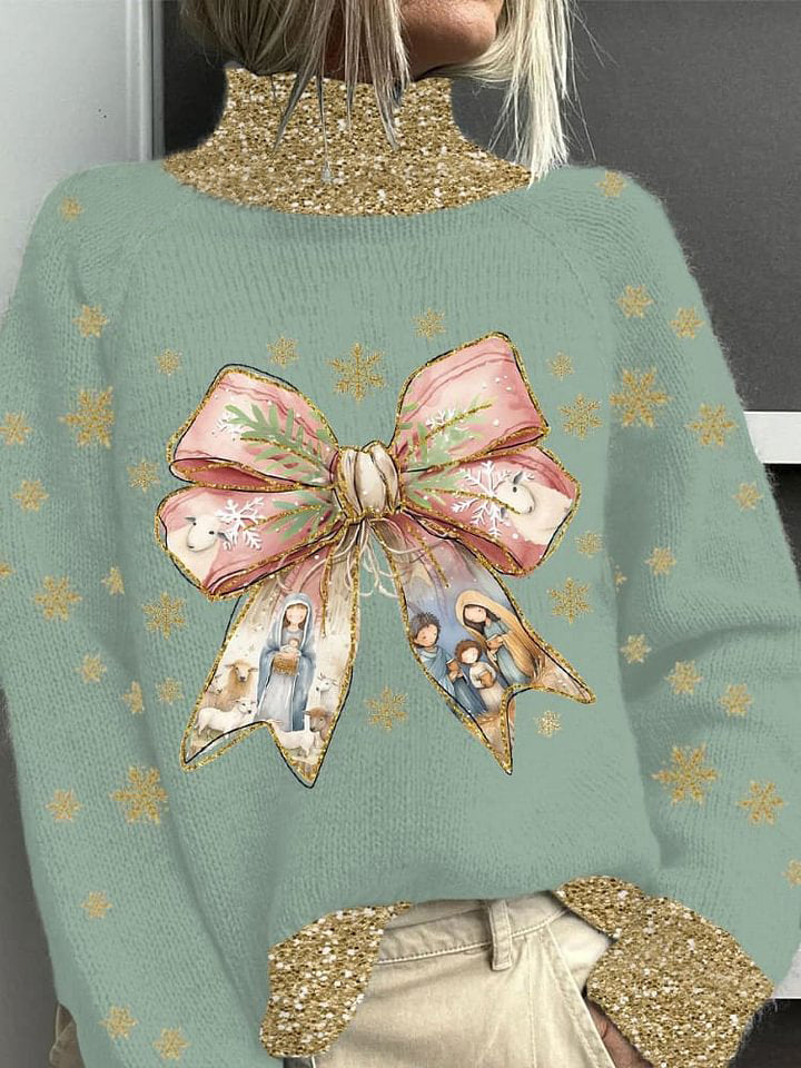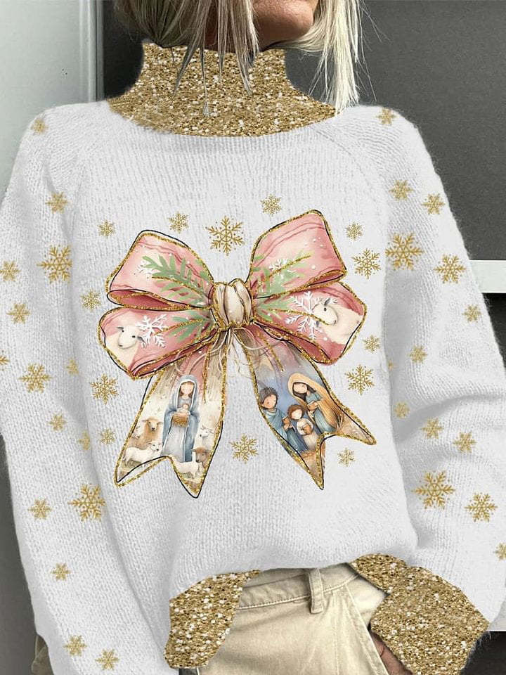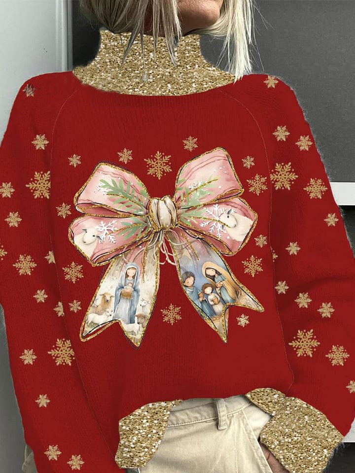 Christmas Let's Adore Him Print Casual Turtleneck Top