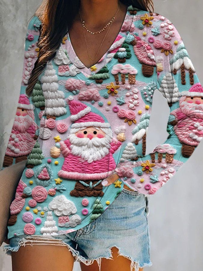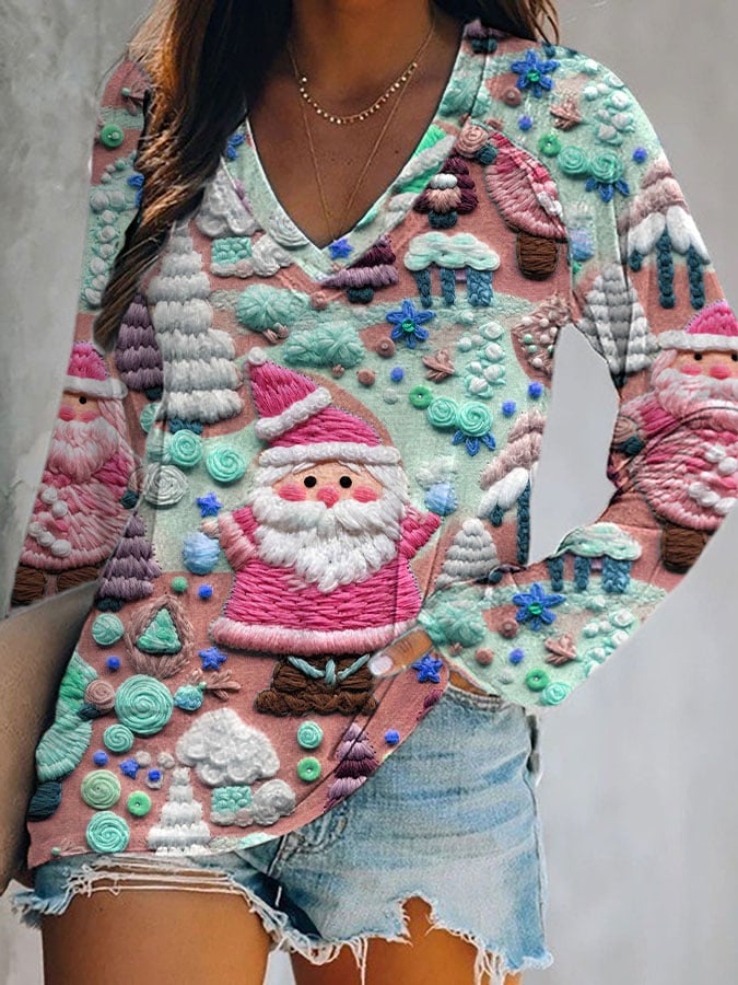 Women's Christmas Pink Santa V-Neck Top