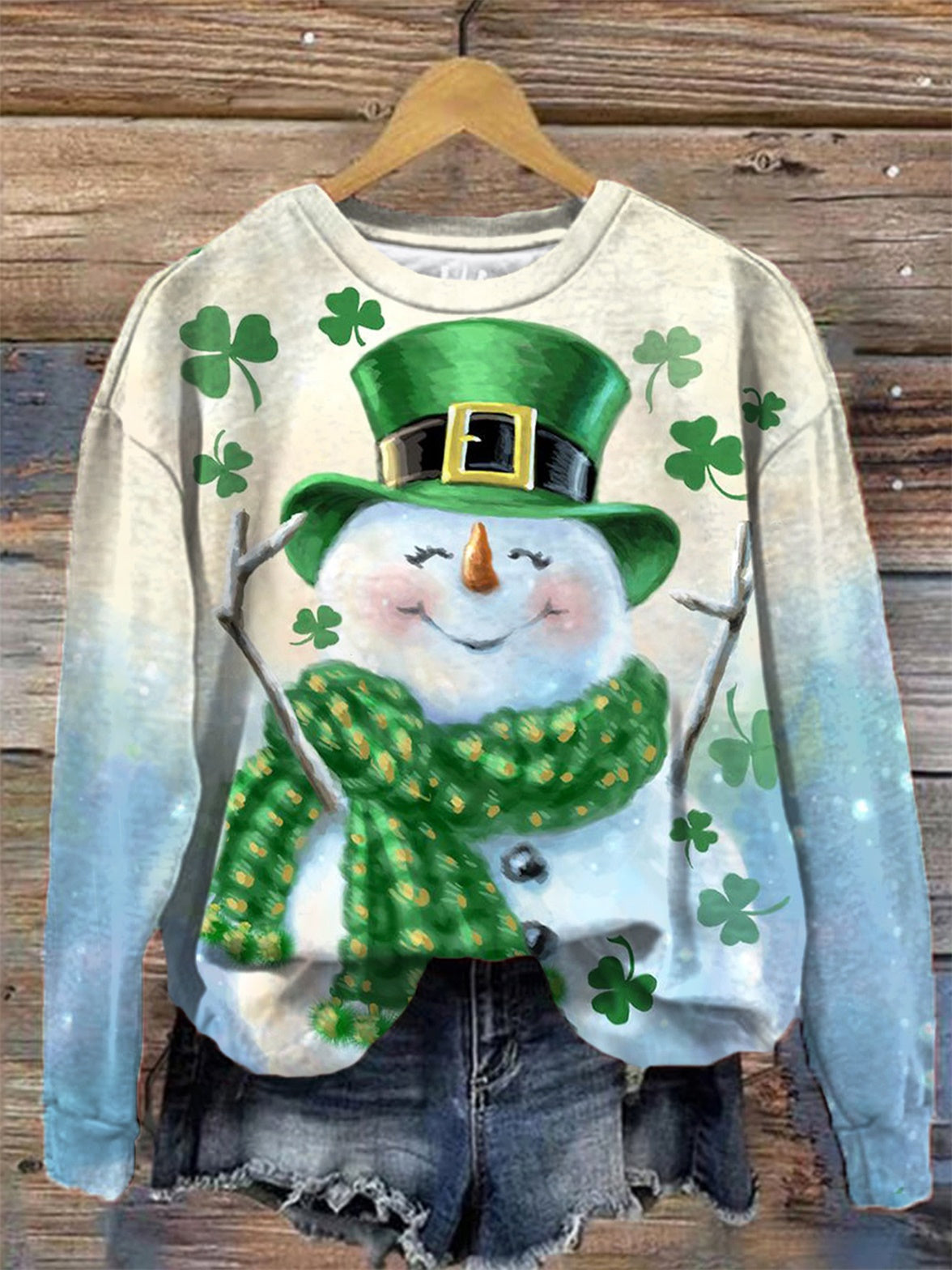Women's Clover Snowman Print Round Neck Long Sleeve Top