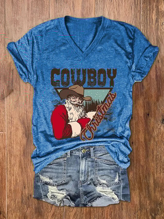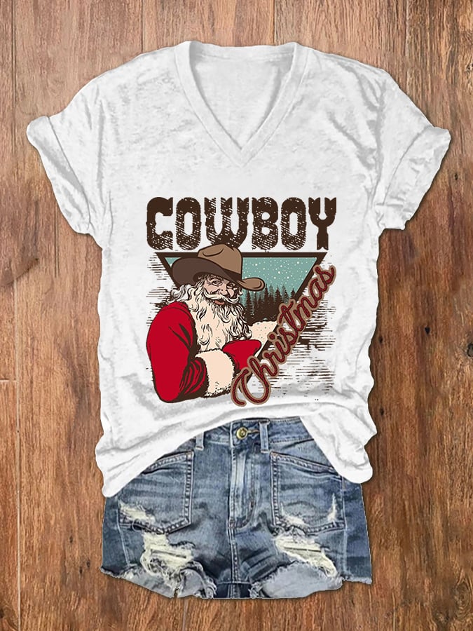 Cowboy Christmas Santa Print V-Neck T-Shirt