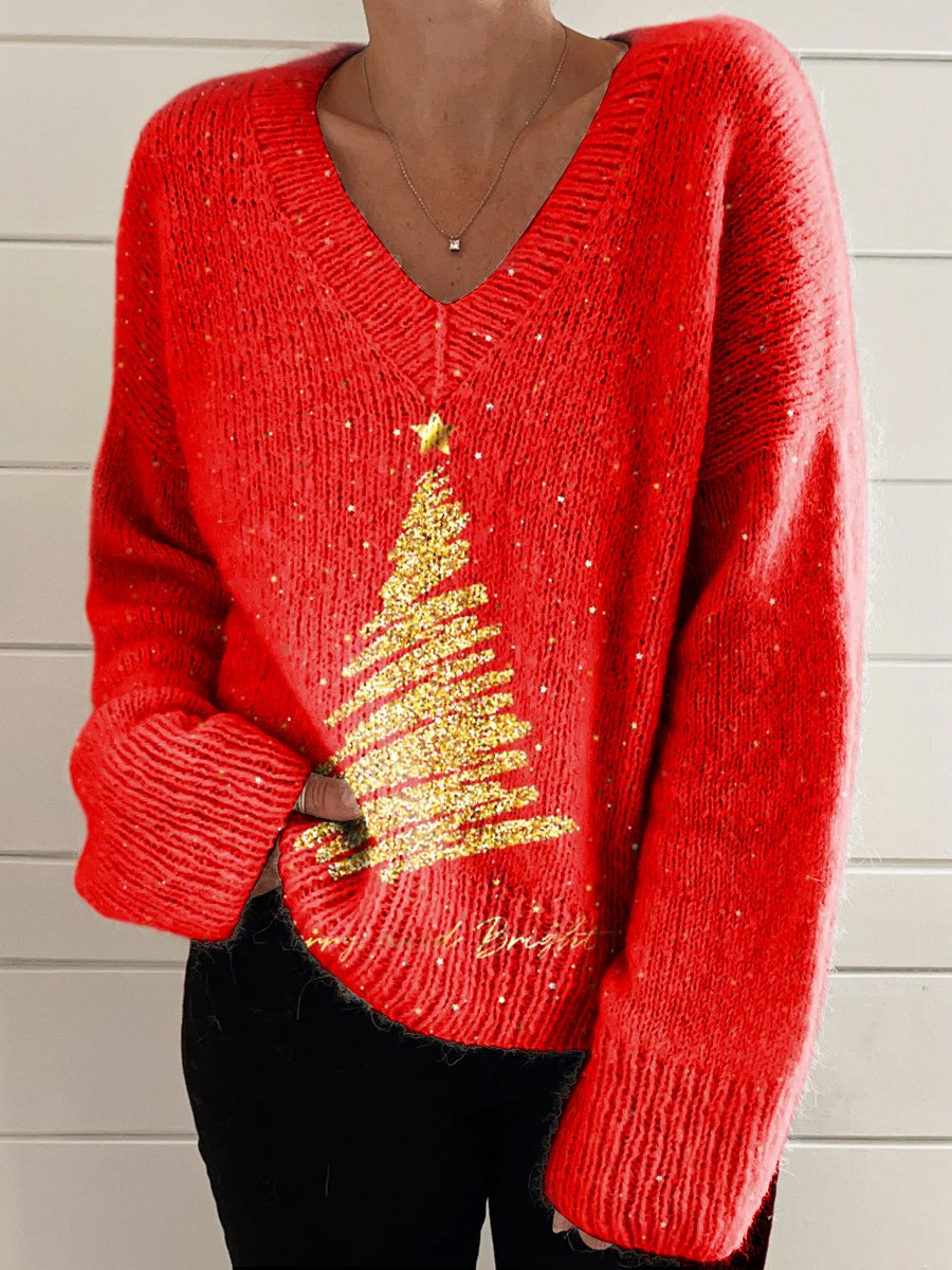 Merry Christmas Art Print Casual V-neck Pullover Knit
