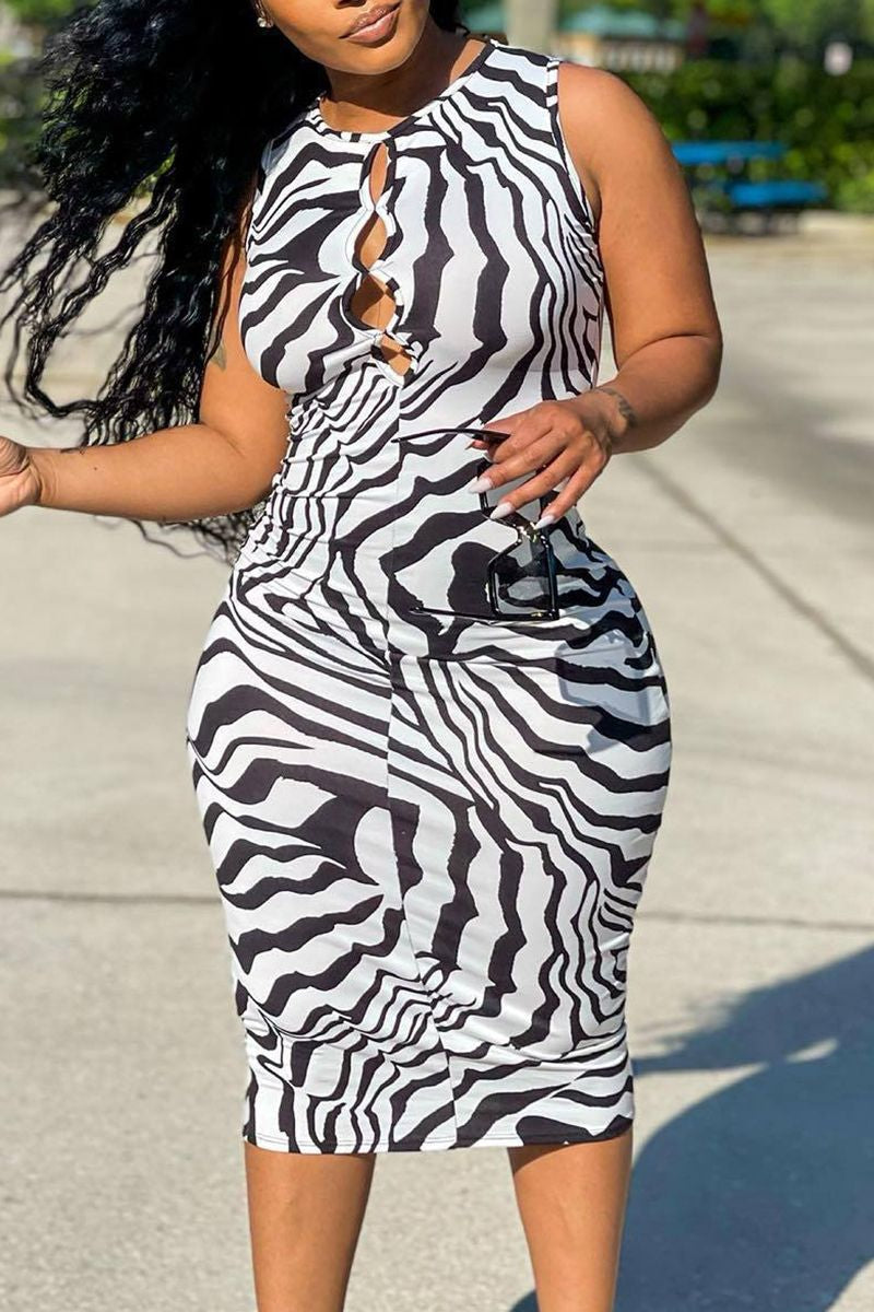 Zebra Striped Hollow Out Midi Dress